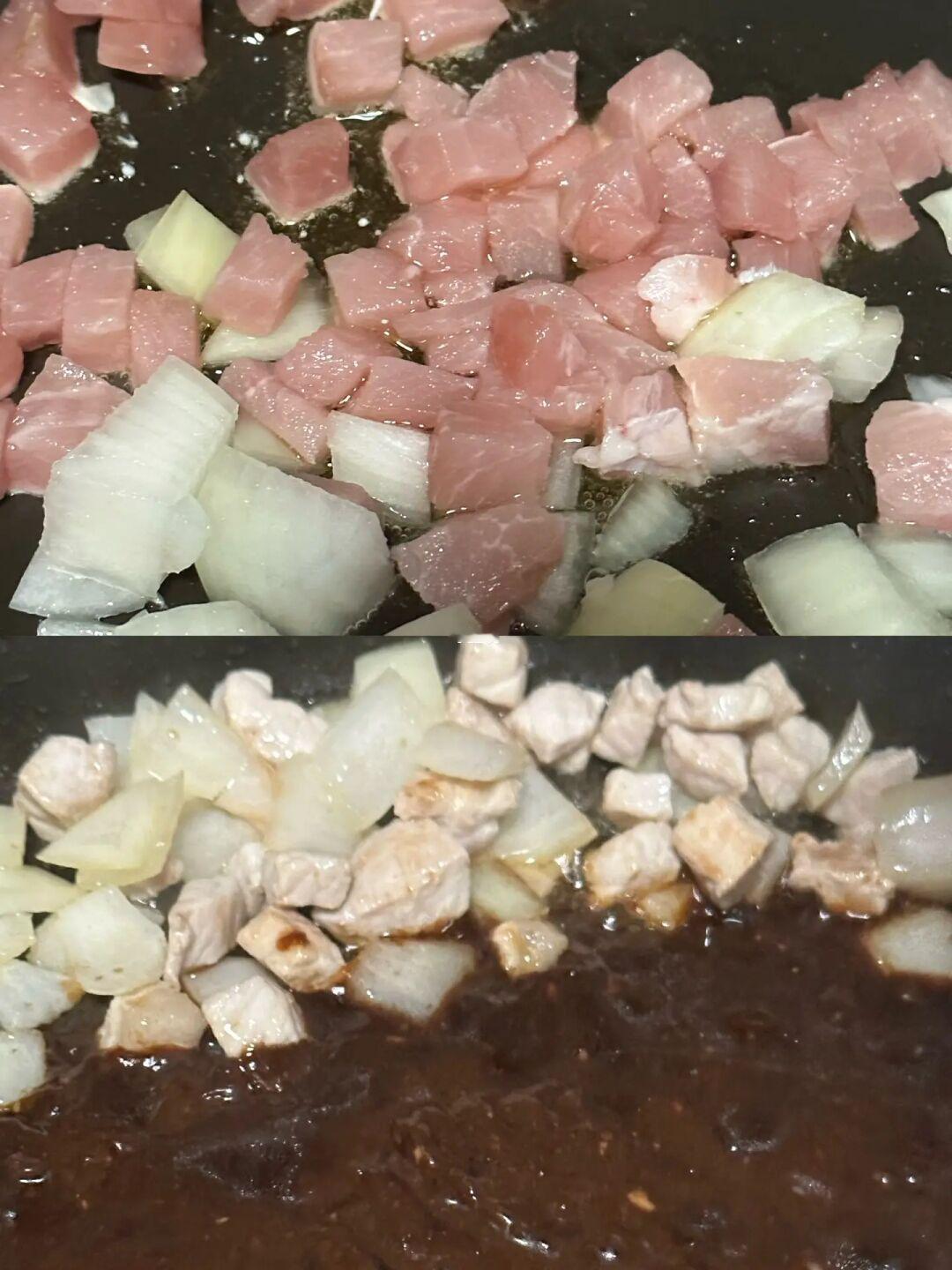 2.肉丁和洋葱炒熟后加入炸酱面酱和水煮至浓稠后浇在面上