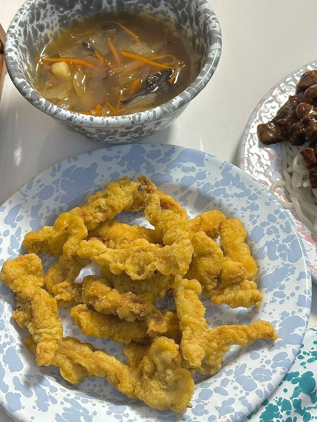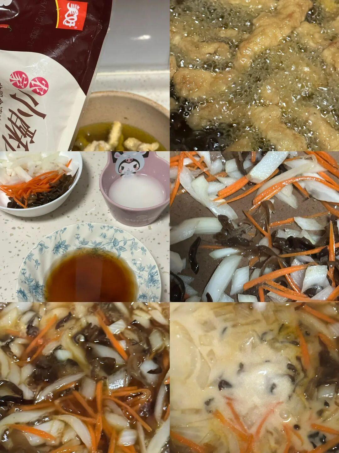 酱汁:木耳丝、胡萝卜丝、洋葱、30g白醋、30g糖、5g酱油(生抽)、水、水淀粉(5g淀粉、水)
