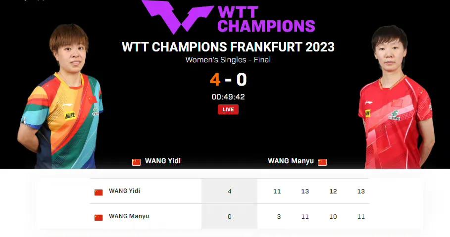 恭喜王艺迪获得WTT冠军赛法兰克福站女单冠军🏆 女单决赛 王艺迪🇨🇳𝟰-𝟬王曼昱🇨🇳【11-3,13-11,12-10,13-11】 王曼昱🇨🇳获得WTT冠军赛法兰克福站女单亚军🥈 大迪延续昨晚好的状态,收据首局快速发动,11:3拿下!第二三局都是在曼昱拿到局点的情况下,大迪落后反而打得更凶狠,逆转拿下的!第四局大迪10:3拿到赛点,曼昱一分一分的咬回来,双方打到11平后大迪抓住机会赢下比赛! 恭喜大迪,恭喜曼昱🎉🎉🎉 下周的女单世排将会发生变化,大迪重回世三,曼昱升至世二,大梦掉到第四,而早田跌出前四来到第五位! #王艺迪夺冠军# #冠军王艺迪# #王艺迪开窍了# #WTT法兰克福冠军赛2023#
