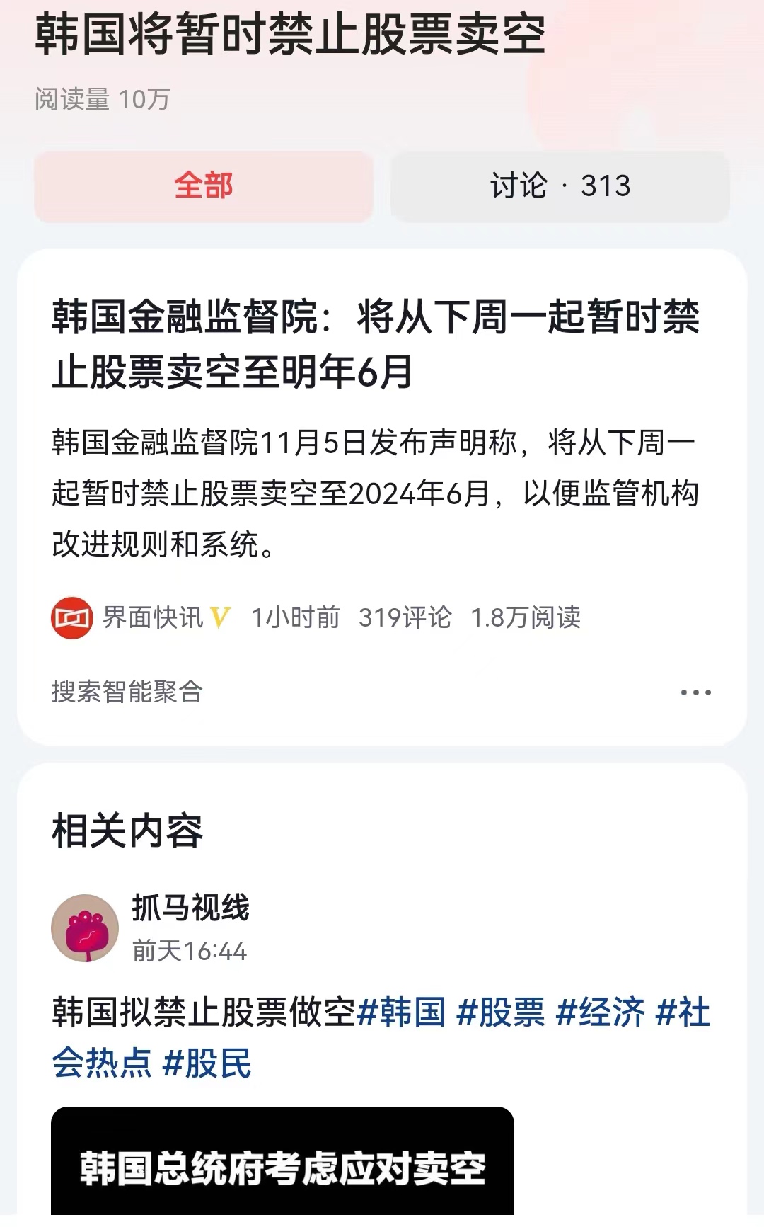 #韩国将暂时禁止股票卖空#韩国的证券监管部门,也就是韩国金融监督院,看看就是敢做敢当。为了保护股市的稳定性,为了保护所有投资者的利益。突然发布声明,将从下周一也就是11月6日开始,暂时禁止股票卖空,期间一直维持到明年的6月份。那么在这段时间韩国的证监部门要干什么呢?