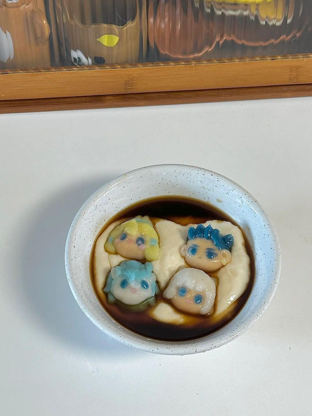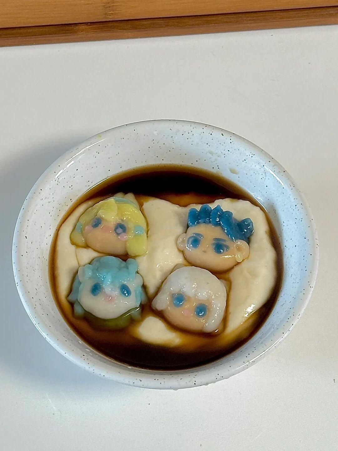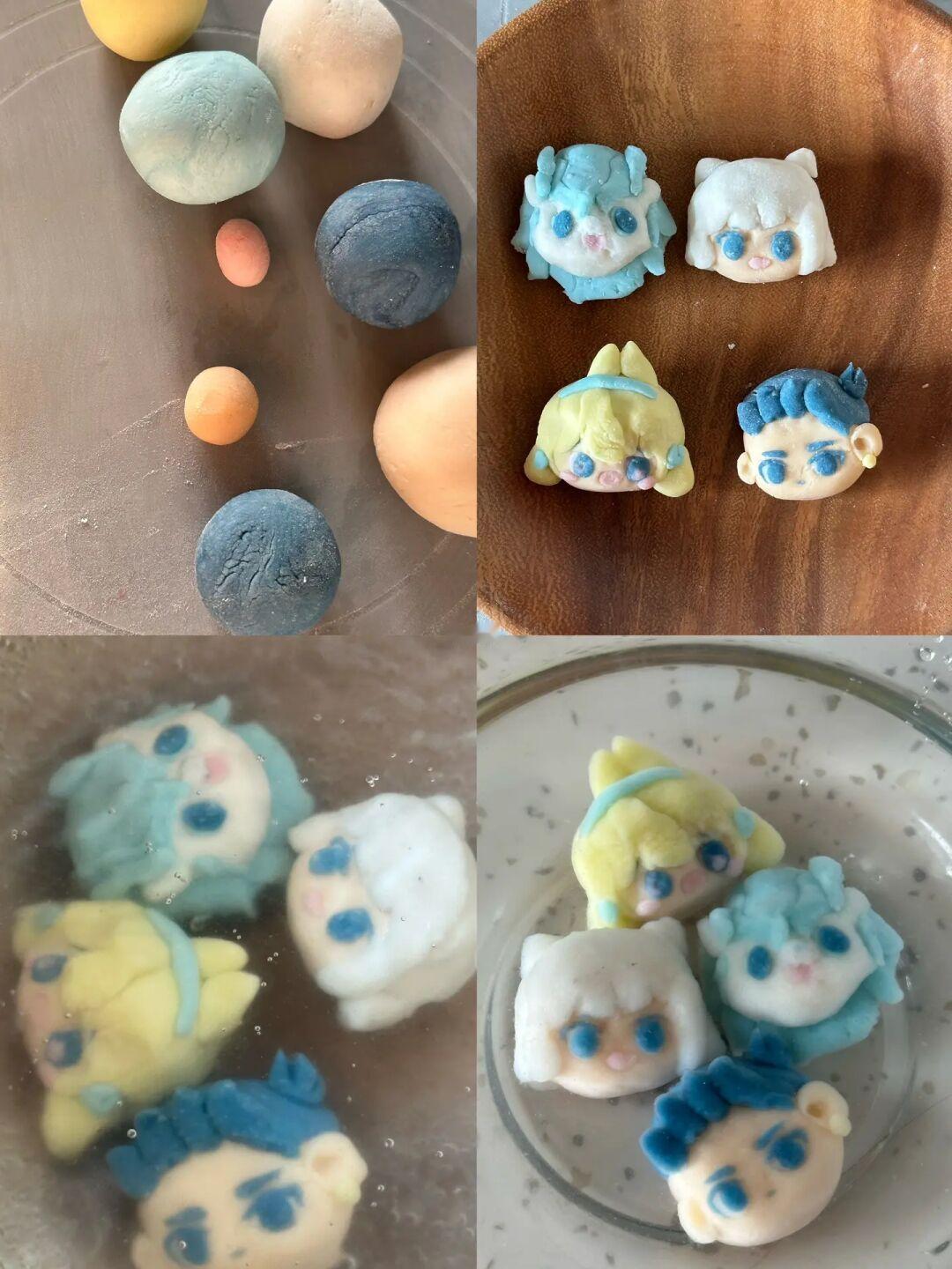 1.汤圆配料混合后分份调色,做出非人哉角色的形象,水开下锅煮至稳定漂浮,过凉水备用