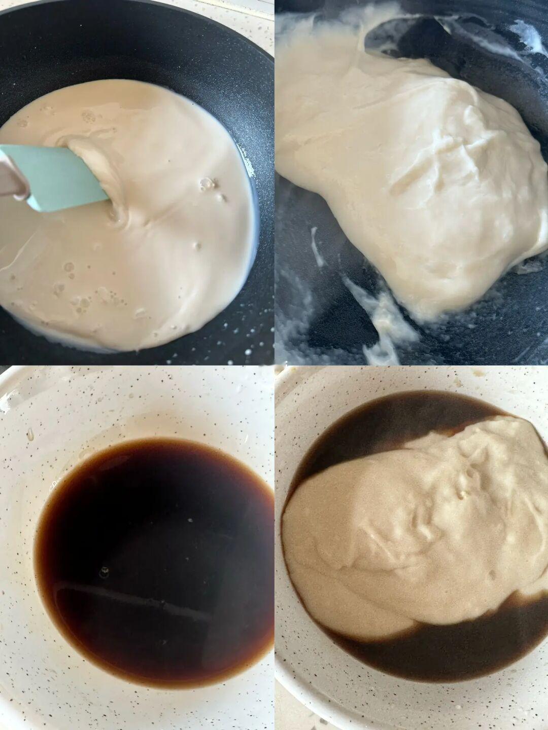 2.鲜奶麻薯配料混合后在不粘锅中搅拌加热至成团
