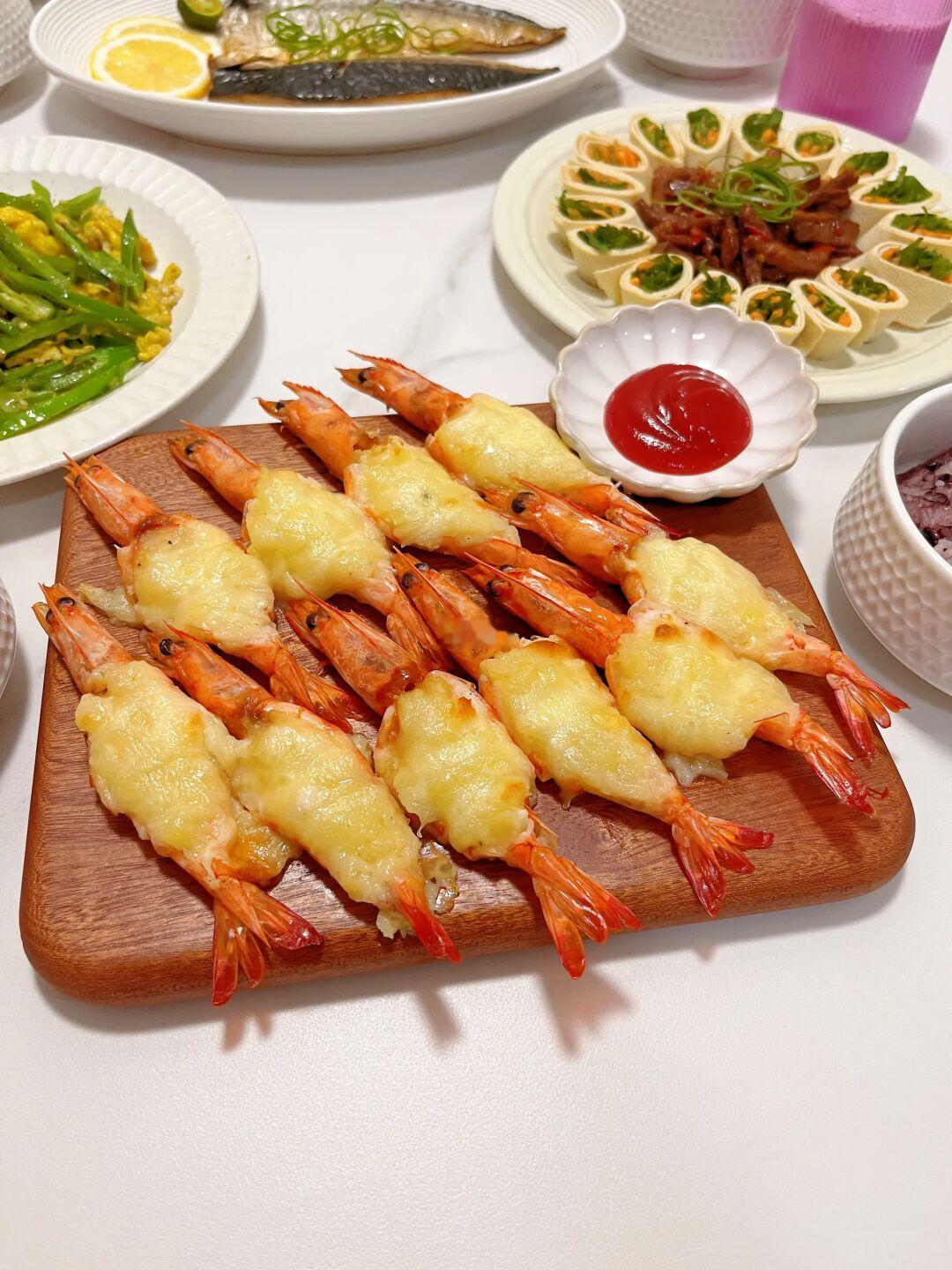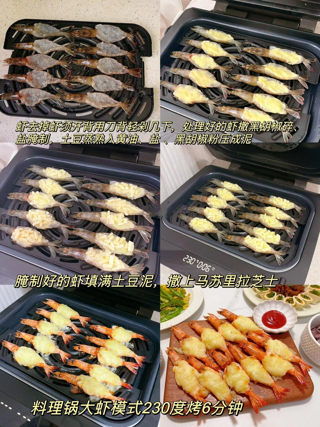 虾去掉虾须开背用刀背轻剁几下,处理好的虾撒黑胡椒碎、盐腌制,土豆蒸熟入黄油、盐 、黑胡椒粉压成泥,腌制好的虾填满土豆泥,撒上马苏里拉芝士180度烤15分钟