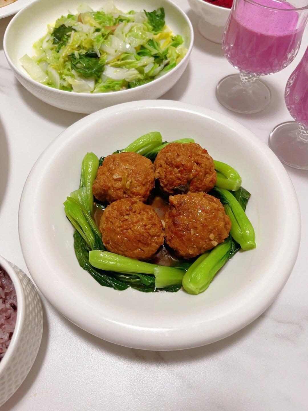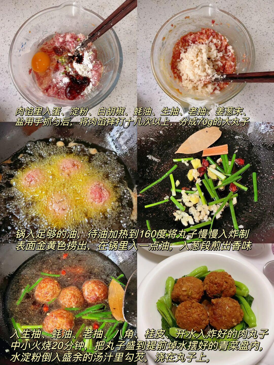 肉馅里入蛋、淀粉、白胡椒、蚝油、生抽、老抽、姜葱末、盐用手抓匀后入莲藕碎拌匀,将肉馅摔打十几次以上,分成70g的大丸子,锅入足够的油,待油加热到160度将丸子慢慢入炸制表面金黄色捞出,在锅里入一点油,入葱段煎出香味后入生抽、蚝油、老抽、八角、桂皮、开水入炸好的肉丸子中小火烧20分钟,把丸子盛到提前焯水摆好的青菜盘内,水淀粉倒入盛余的汤汁里勾芡,浇在丸子上