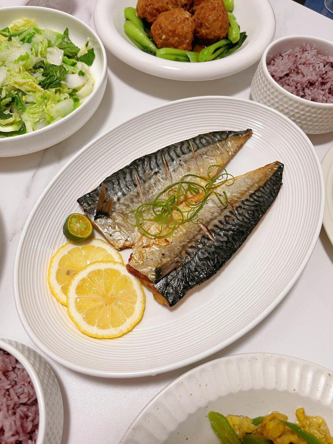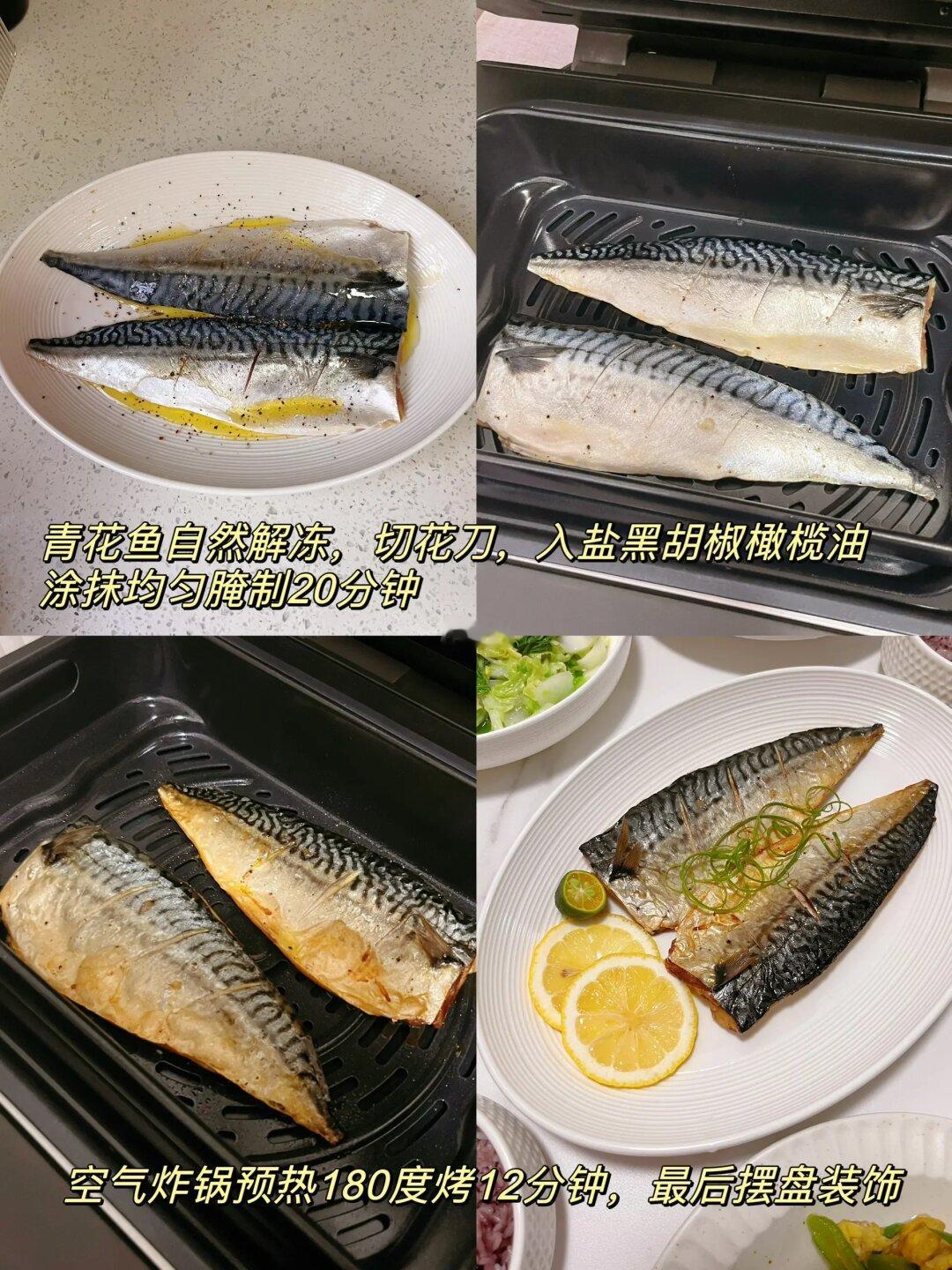 青花鱼自然解冻,切花刀,入盐黑胡椒橄榄油涂抹均匀腌制20分钟,空气炸锅预热180度烤12分钟,最后摆盘装饰