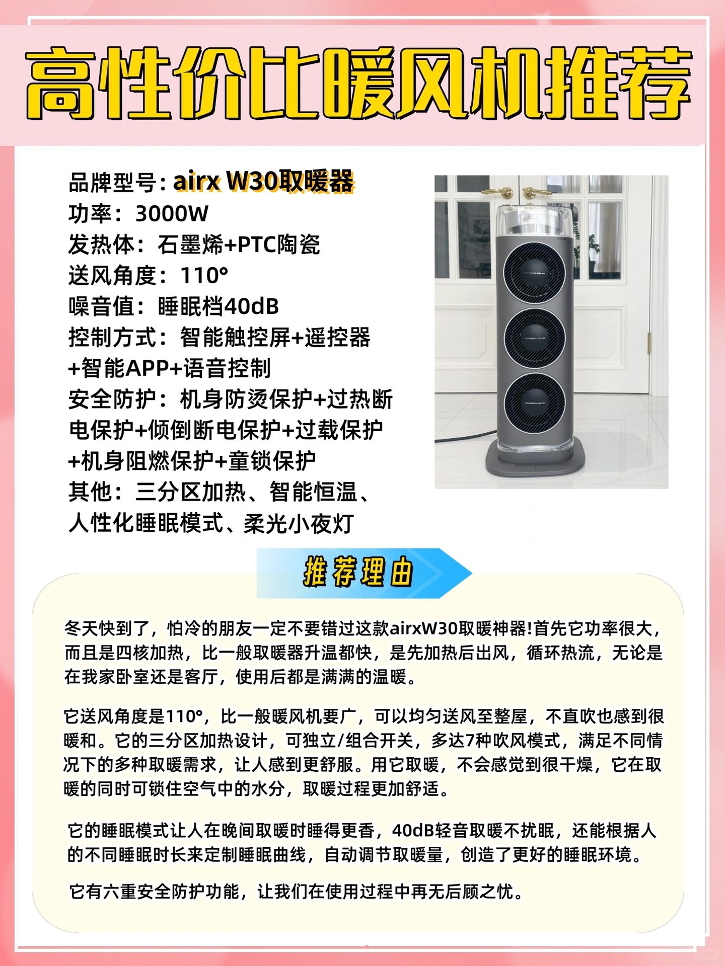 [星R]家里有娃养宠也不用担心,它的六重安全防护功能,让我们在使用过程中完全无后顾之忧。还不知道买什么取暖器的,可以考虑入手这款airx W30取暖器~