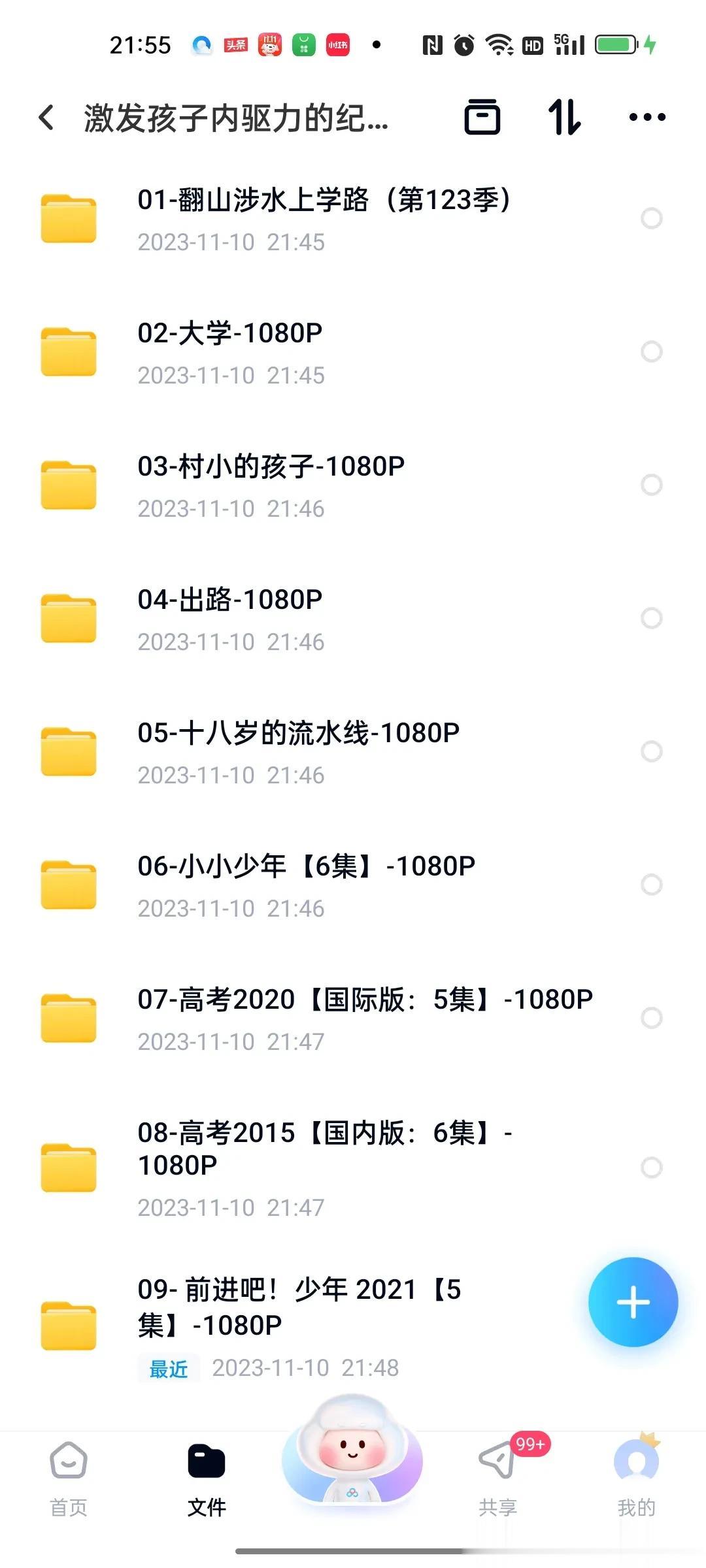 今晚的纪录片,又把娃们震住了[耶]想要培养娃的内驱力,一定不要错过这些免费的纪录片。 娃最近突然对大学比较感兴趣,总是追着博士爸问一些关于大学的事情,于是趁热打铁,给娃找来纪录片《大学》,看完纪录片,完全刷新了娃对大学的认知。看各地的状元与清华大学招生组谈判,才知道原来清华的招生也是可以谈判的,只要你足够优秀。看清华的讲授上课,娃才知道上了清华,就可以认识那么多的顶级科学家。看清华的各种社团活动,娃才知道大学生活是多么的丰富多彩。看完纪录片,娃的两眼放光,立刻找到了自己的目标。 除此之外,还有很多励志纪录片都可以给娃看。如果娃不爱学习,可以试试下面几个纪录片,瞬间唤醒娃的内驱力。 纪录片可免费分享,有需要的家人可留言。