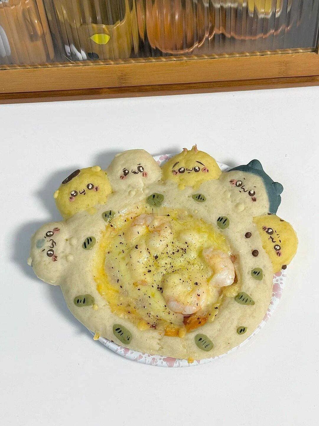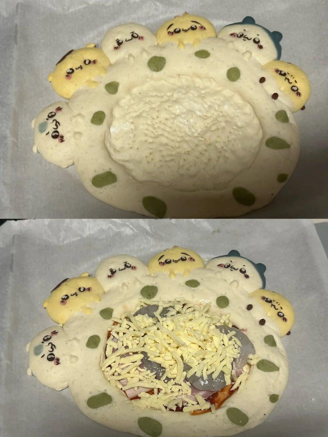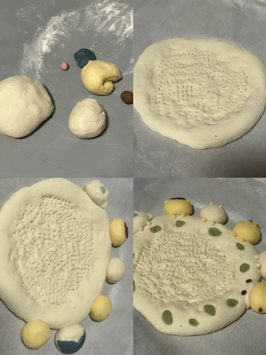 1.面团配料混合后,分份调色,发酵至2倍大,白色做出披萨底,依次做好宝宝们(中间要有间隔)