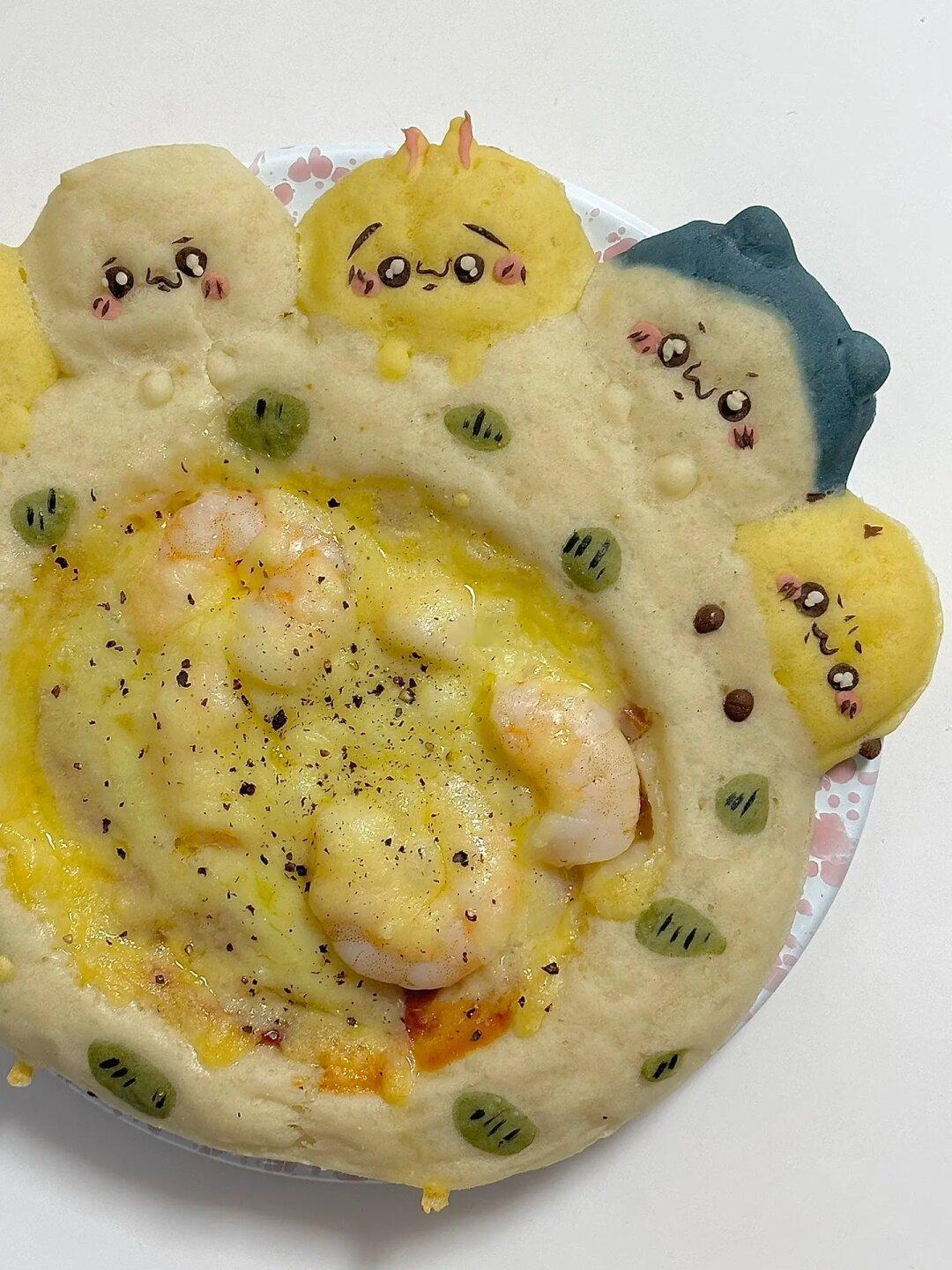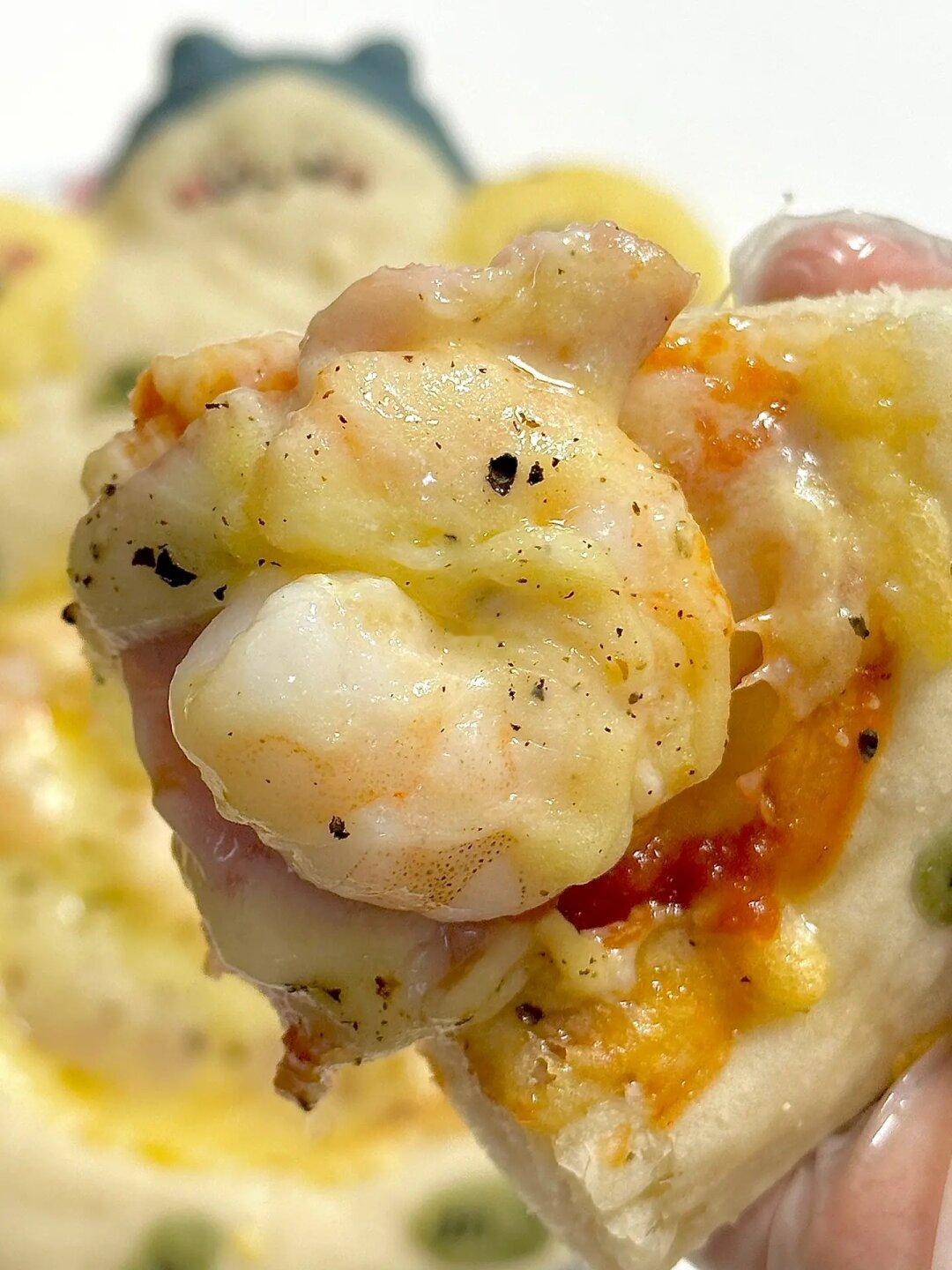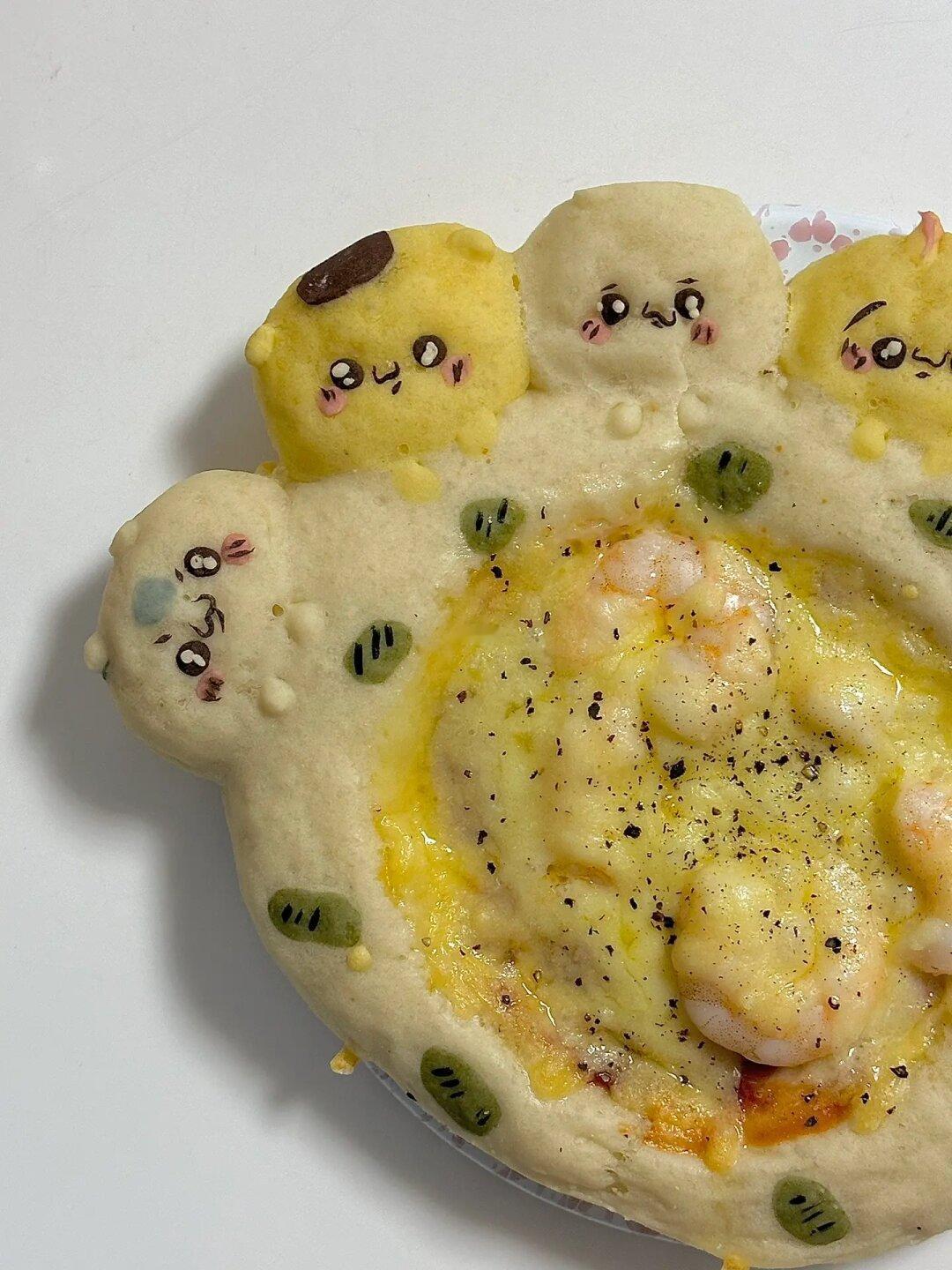 1.面团配料混合后,分份调色,发酵至2倍大,白色做出披萨底,依次做好宝宝们(中间要有间隔)