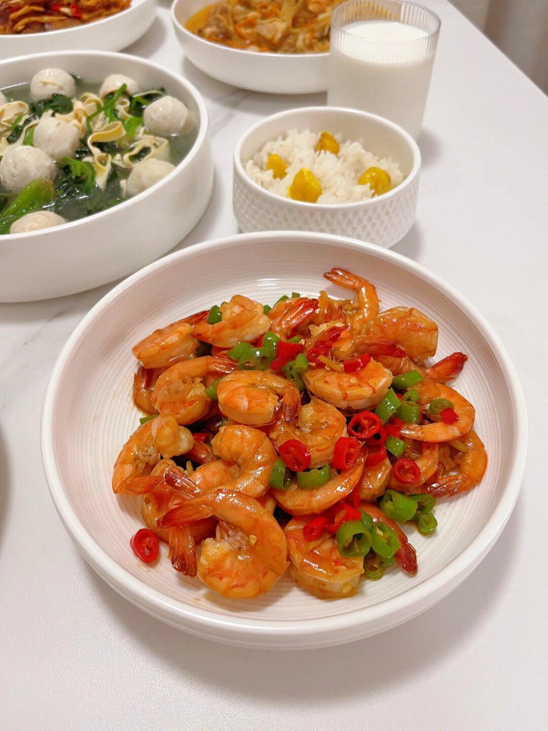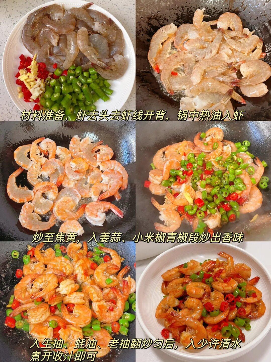 材料准备,虾去头去虾线开背,锅中热油入虾炒至焦黄,入姜蒜、小米椒青椒段炒出香味,入生抽、蚝油、老抽翻炒匀后,入少许清水煮开收汁即可。