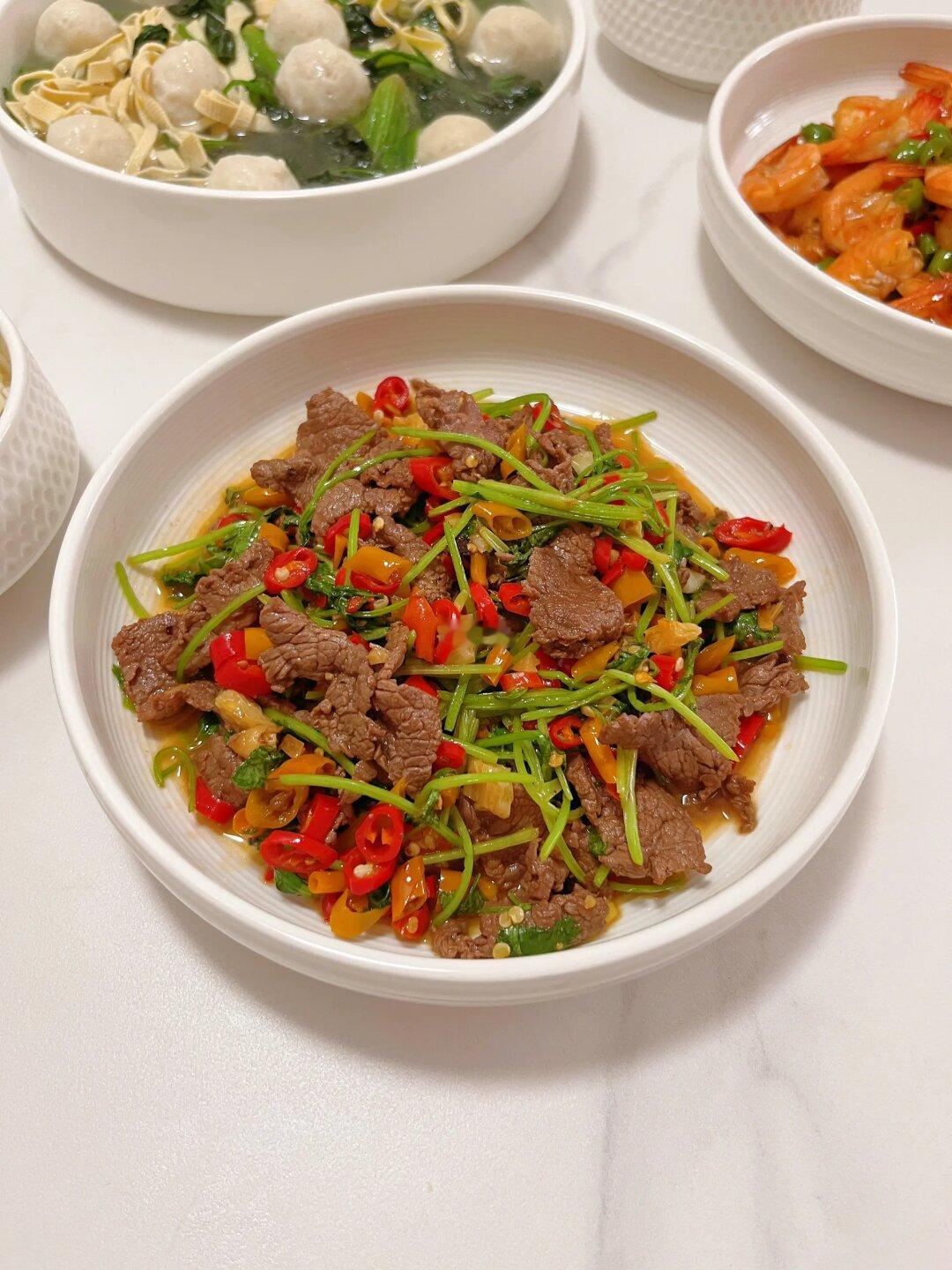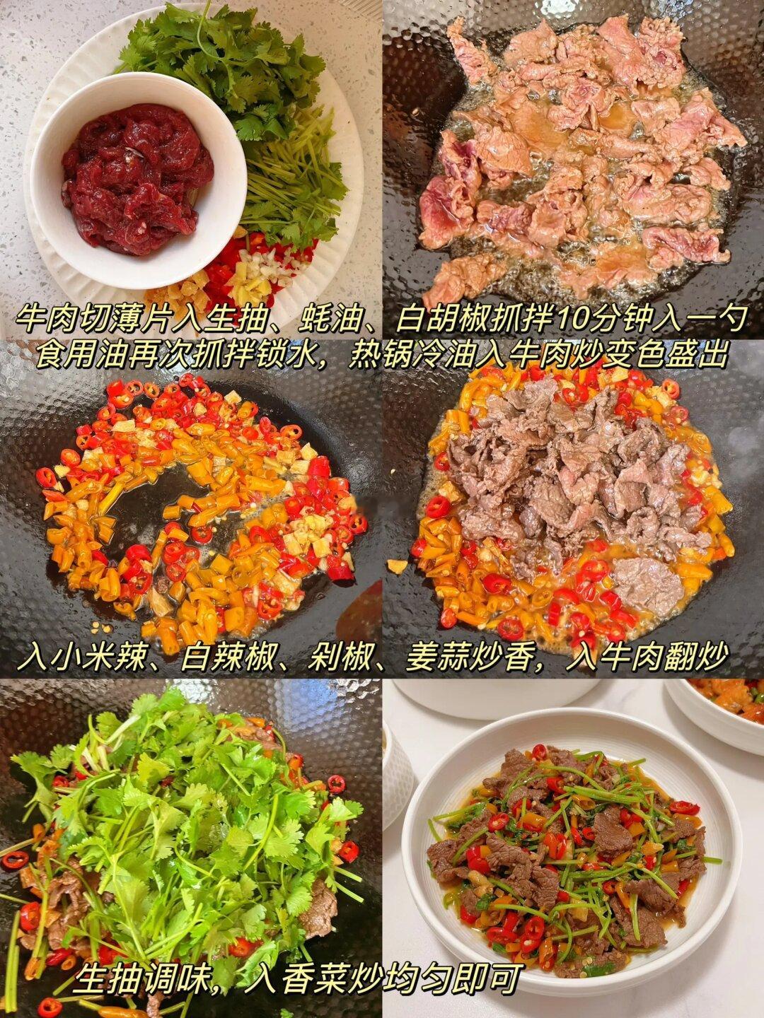 牛肉切薄片入生抽、蚝油、白胡椒抓拌10分钟入一勺食用油再次抓拌锁水,热锅冷油入牛肉炒变色盛出,入小米辣、白辣椒、剁椒、姜蒜炒香,入牛肉翻炒,生抽调味,入香菜炒均匀即可。