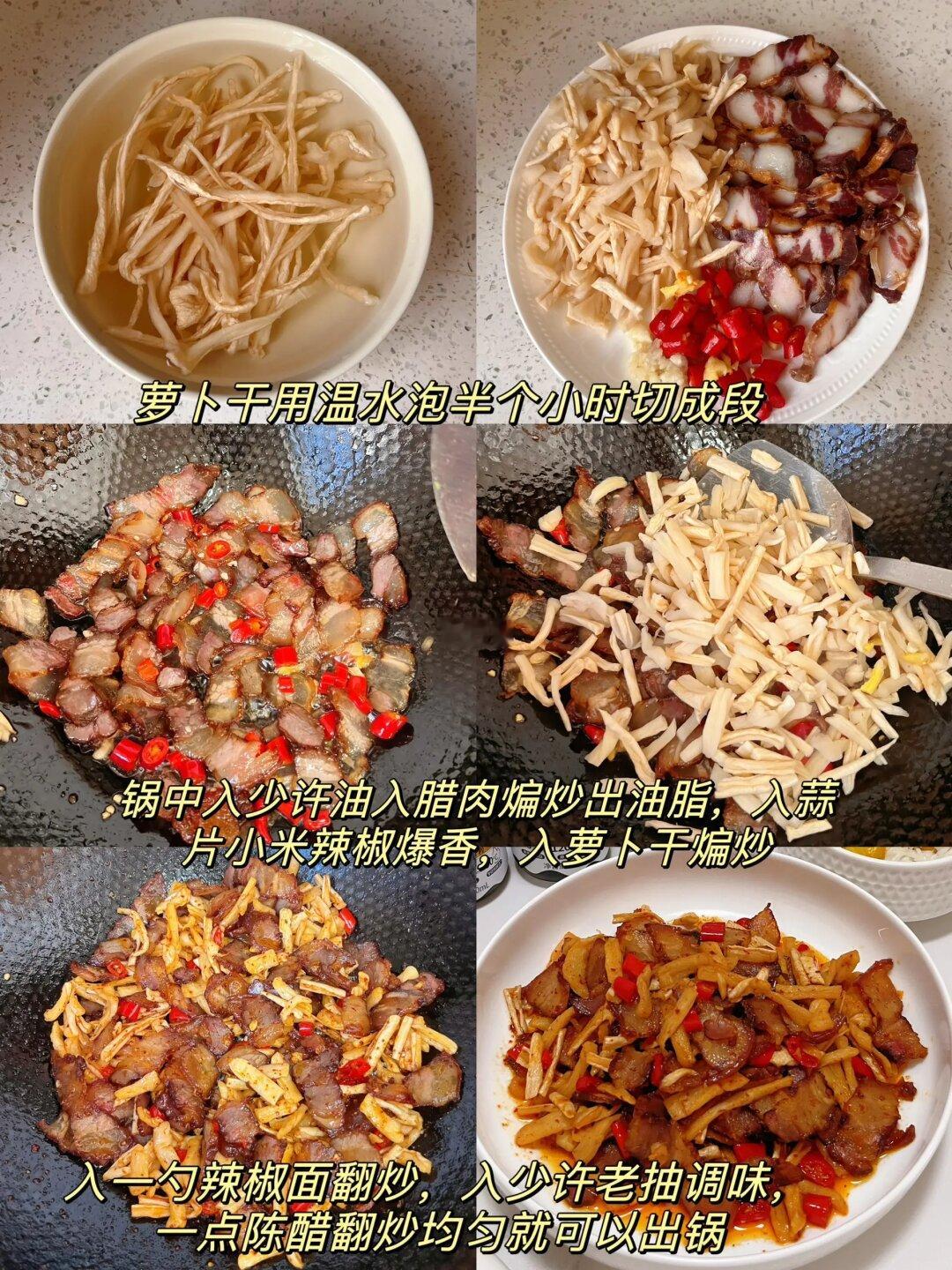 萝卜干用温水泡半个小时切成段,锅中入少许油入腊肉煸炒出油脂,入蒜片小米辣椒爆香,入萝卜干煸炒,入一勺辣椒面翻炒,入少许老抽调味,一点陈醋翻炒均匀就可以出锅。