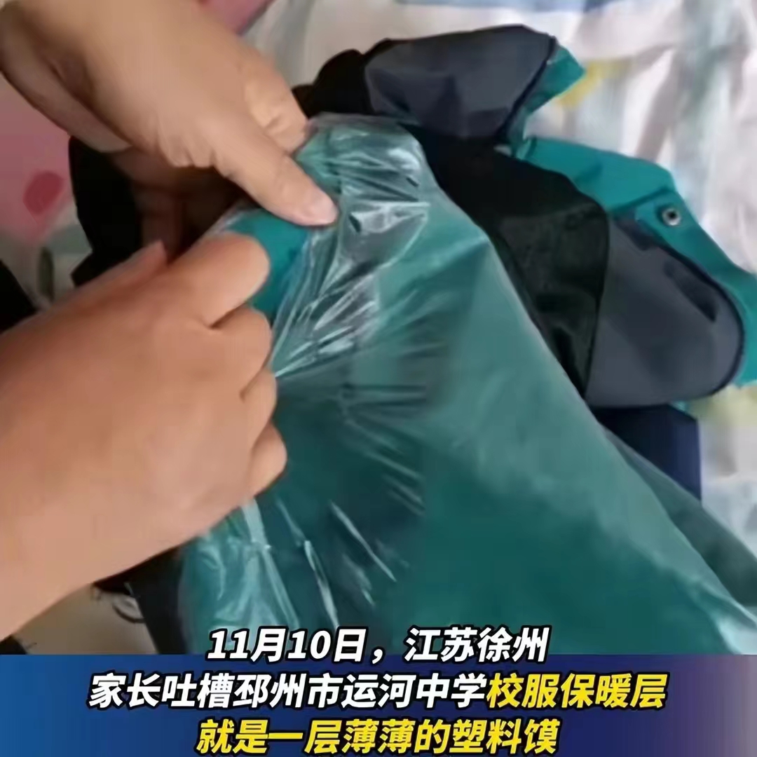 江苏徐州某中学,家长领到了刚发下来的冬季校服,总觉得好像中间的夹层有问题。于是打开之后,发现了里面都是塑料膜,同时还用胶水进行隔层粘连。确实夹层使用塑料膜,因为不透气有可能会保一点温,但这绝对是20多年前保暖的理念和做法,或者说是当年那一代谋取暴利的秘密!#徐州本地事#
