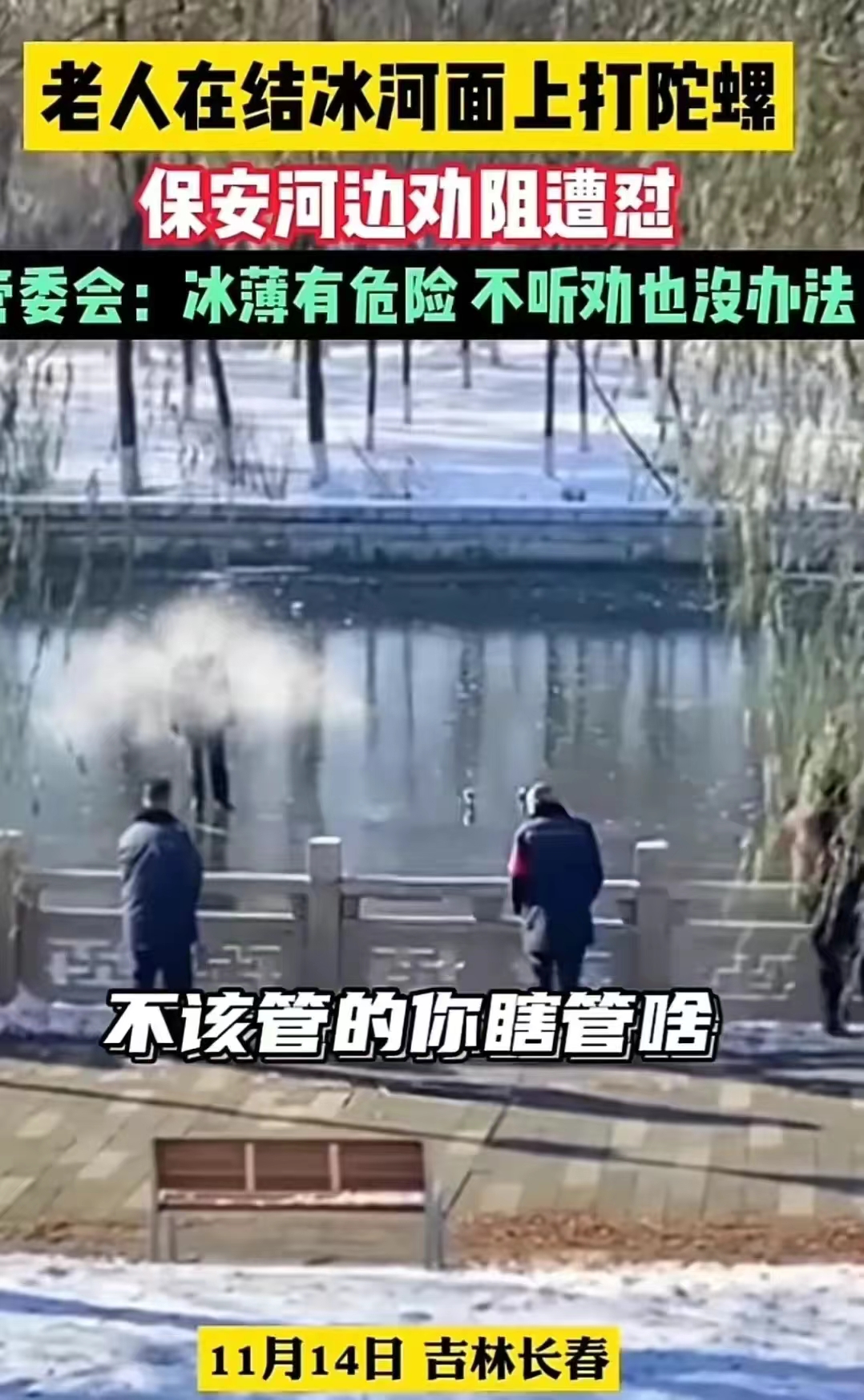 在吉林省吉林市,一位身穿黑色羽绒服的大爷,正在高兴的打陀螺锻炼身体。这也是北方常见的一种冬季体育活动。两名在岸上的保安在劝他上岸,讲冰层还没冻结实。只有遭到大爷激动的回怼“该管的管,不该管的就别多管闲事”,而且强调“给你点面子就不错了”。