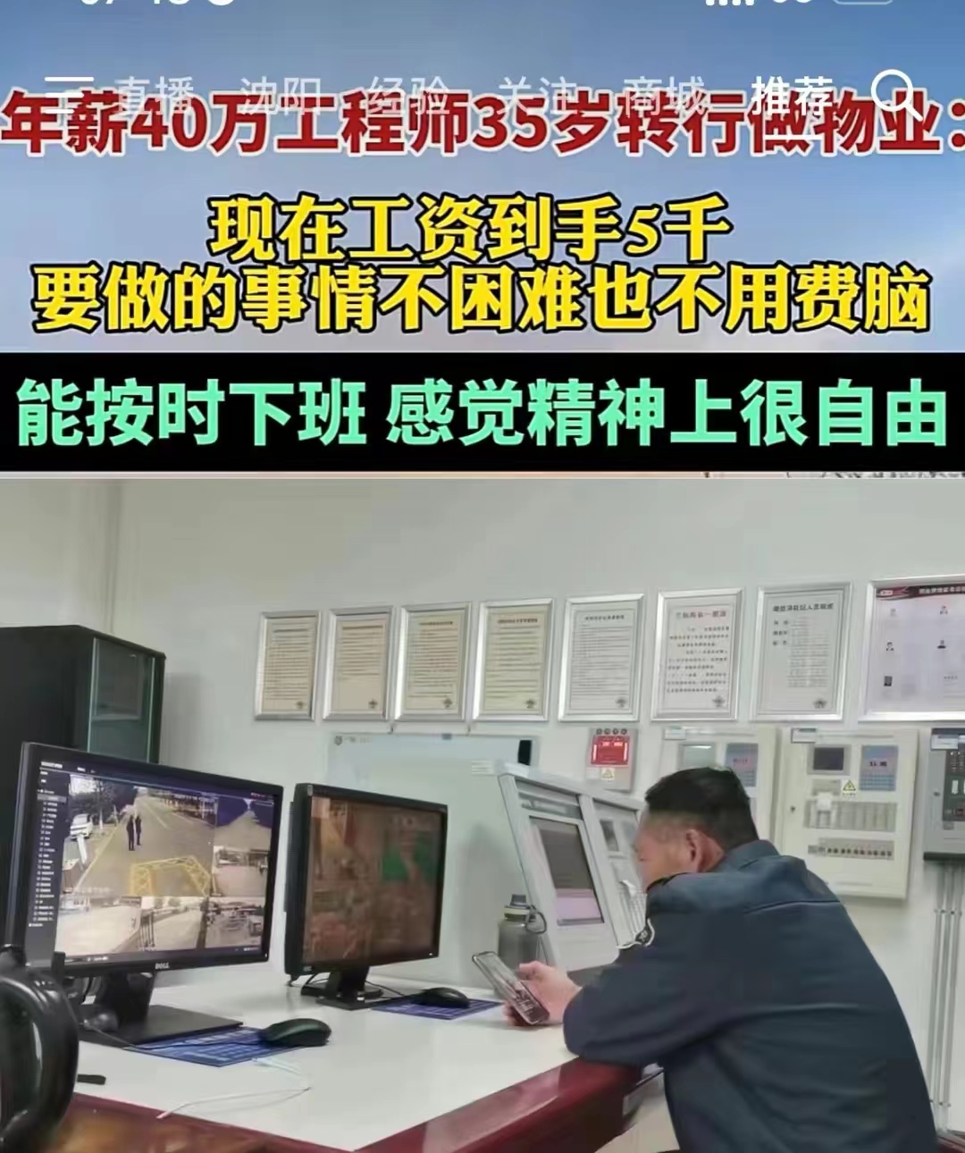 江苏南京有一位建筑工程师,之前税后年薪达到40万。现在整个行业也不景气,竞争压力也越来越大,内卷化也是越来越严重,在这种情况下,35岁选择转行做物业管理人员。想一想每月稳定发工资,又有五险一金,也不用再内卷了,还可以服务社区民众,这何尝不是一个最好的选择呢?