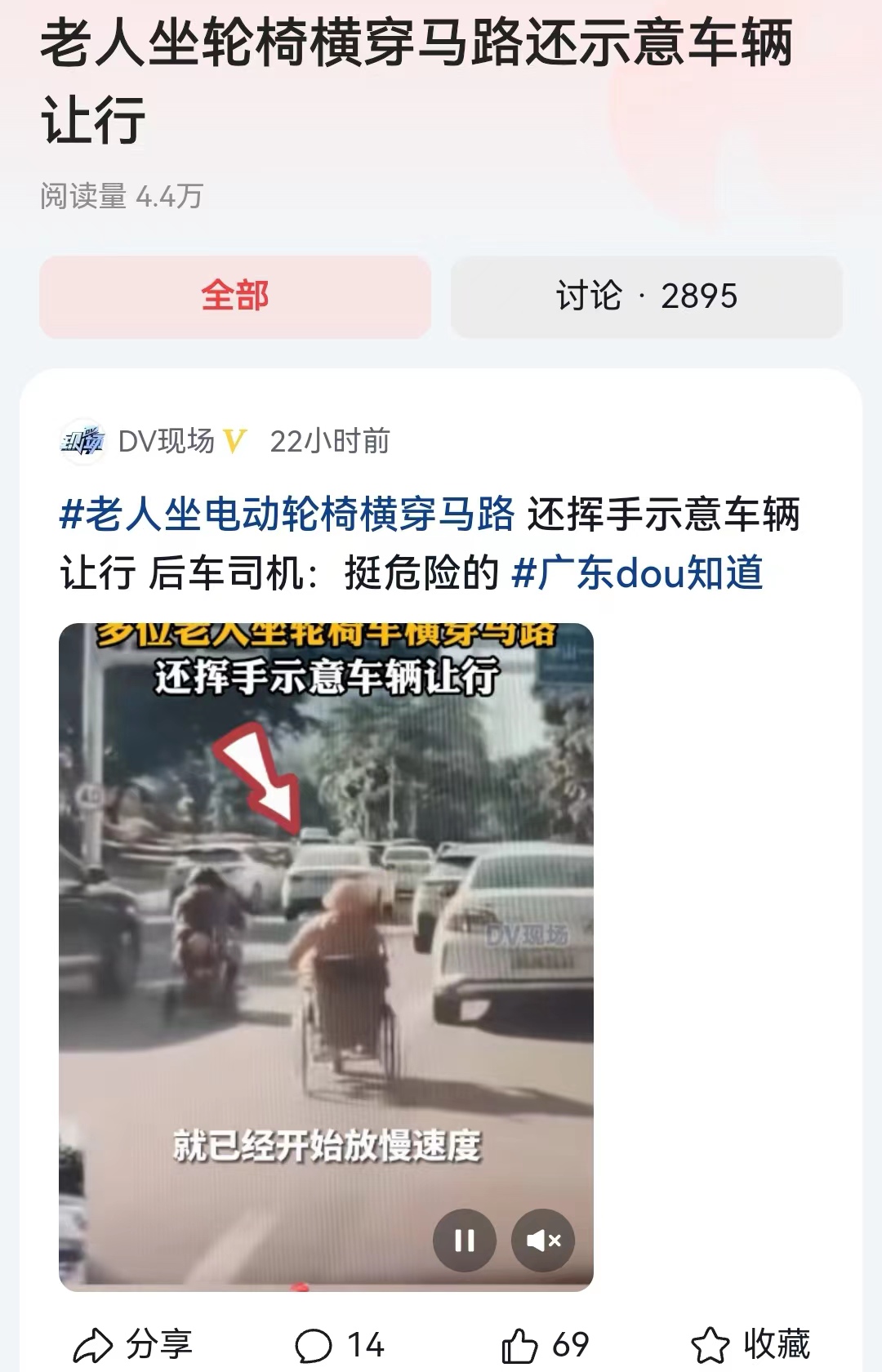 #老人坐轮椅横穿马路还示意车辆让行#没办法,碰到这种开电动轮椅的,不论他是否遵守交通规则,都得给他让。因为对方是用生命在开轮椅,其他的人不论是步行的,骑自行车的还是开车的,怎么敢去招惹他呢?难道用自己未来的收入、纠缠不清的事情、以无情无尽的烦恼,冒这种风险吗?
