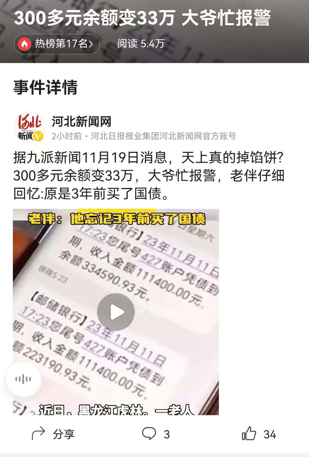 #300多元余额变33万 大爷忙报警# 三年前的国债利率还是挺高的,年化利率达到3.8%。黑龙江虎林的大爷,在三年前买了30万的国债,结果忘记了。但是国债到期之后,会自动向当时购买的银行返回本金和利息。大爷一下子有点懵了,是不是遭遇了电信诈骗?后面会不会跟着骗局在左思右想之下决定向派出所进行报警?