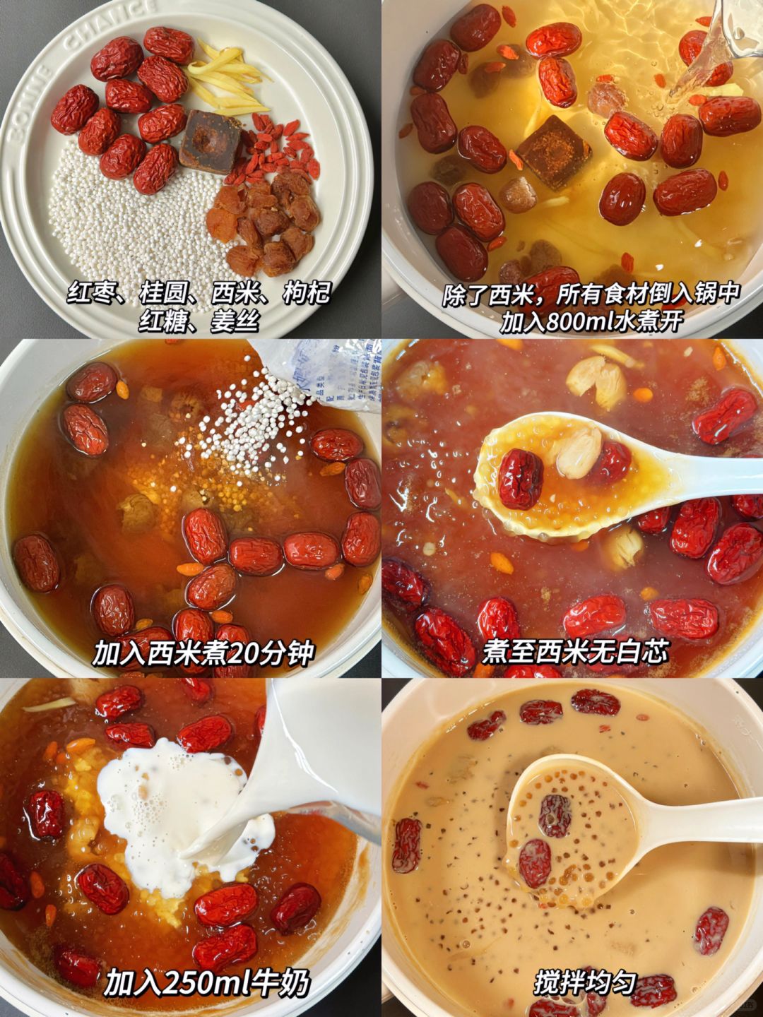 ✅食材:牛奶🥛+红糖+红枣+桂圆+枸杞