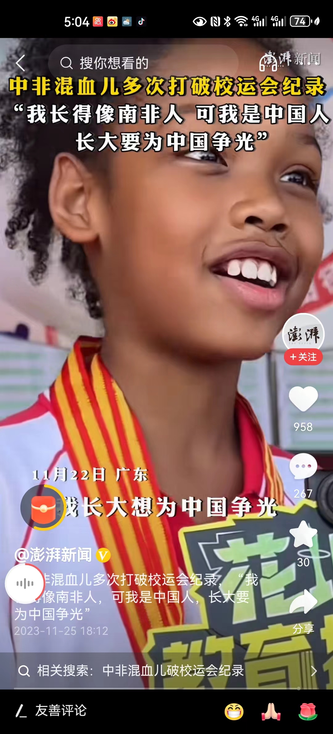 #中非混血儿多次打破校运会纪录# 随着对外开放的深入,世界各种族的融合也越来越多了。据说广州有着10万非洲来的黑人,他们生根发芽驻扎下来,跨国婚姻自然也越来越多,最终出现的这种混血儿也越来越多。但是没关系,只要有着中国的认同感和归属感,不论是什么皮肤,他都将是中国人,他的子孙也都将是中国人。
