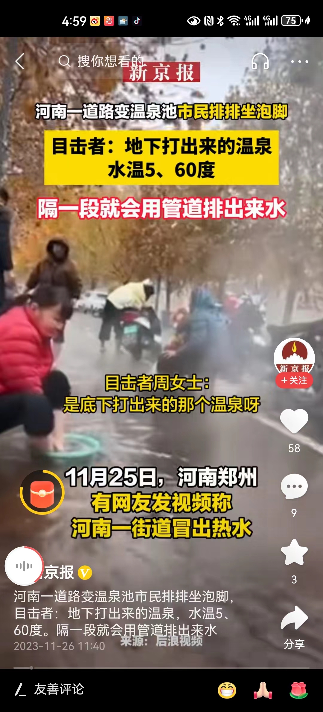 这是发生在河南郑州的一件奇事,当地人说,好几年前曾经有人在地下打出了这口“暖心温泉”,如今导致隔一段时间就会从管道里涌出温暖的热水,水温达到五六十度。所以当这些水冒出来的时候,大家就搬着板凳,拿着脸盆过来泡脚。还有人在下游洗衣服、洗车,“温泉活动”更加生动有趣。#河南身边事儿#