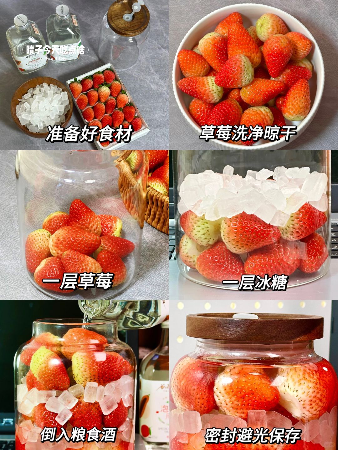 救命🆘…..想不到自己做的草莓酒这么好喝😭 草莓果香浓郁➕淡淡的酒香🥂微醺的刚刚好! 💕甜甜的,不会涩口,特别适合女孩子~ 姐妹们快去试试! . ✅准备:草莓🍓、粮食酒、冰糖、密封罐 ✅比例:1:1:0.6(例如1斤草莓:1斤酒:0.6斤冰糖) ✅步骤:草莓洗净擦干,密封罐洗净完全晾干,然后一层草莓一层冰糖装至九分满,倒入酒,密封阴凉处保存就可以啦