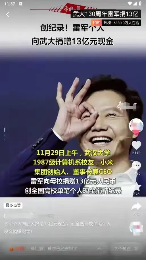 其实这里面有一个小故事,当年雷军在武汉大学读书时,曾经拿到过2000元的奖学金。他也曾许下“十倍、百倍、万倍还回来”的誓言。其实他已经早已完成了他的承诺,在之前也曾经向母校多次捐款。当然在这一次破记录的捐款,母校的学子乐开了花。