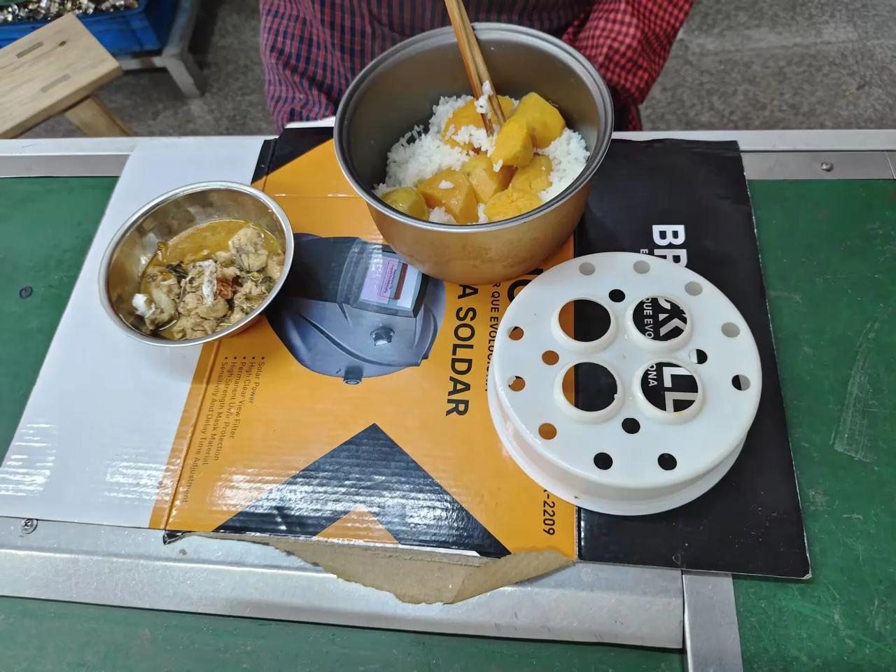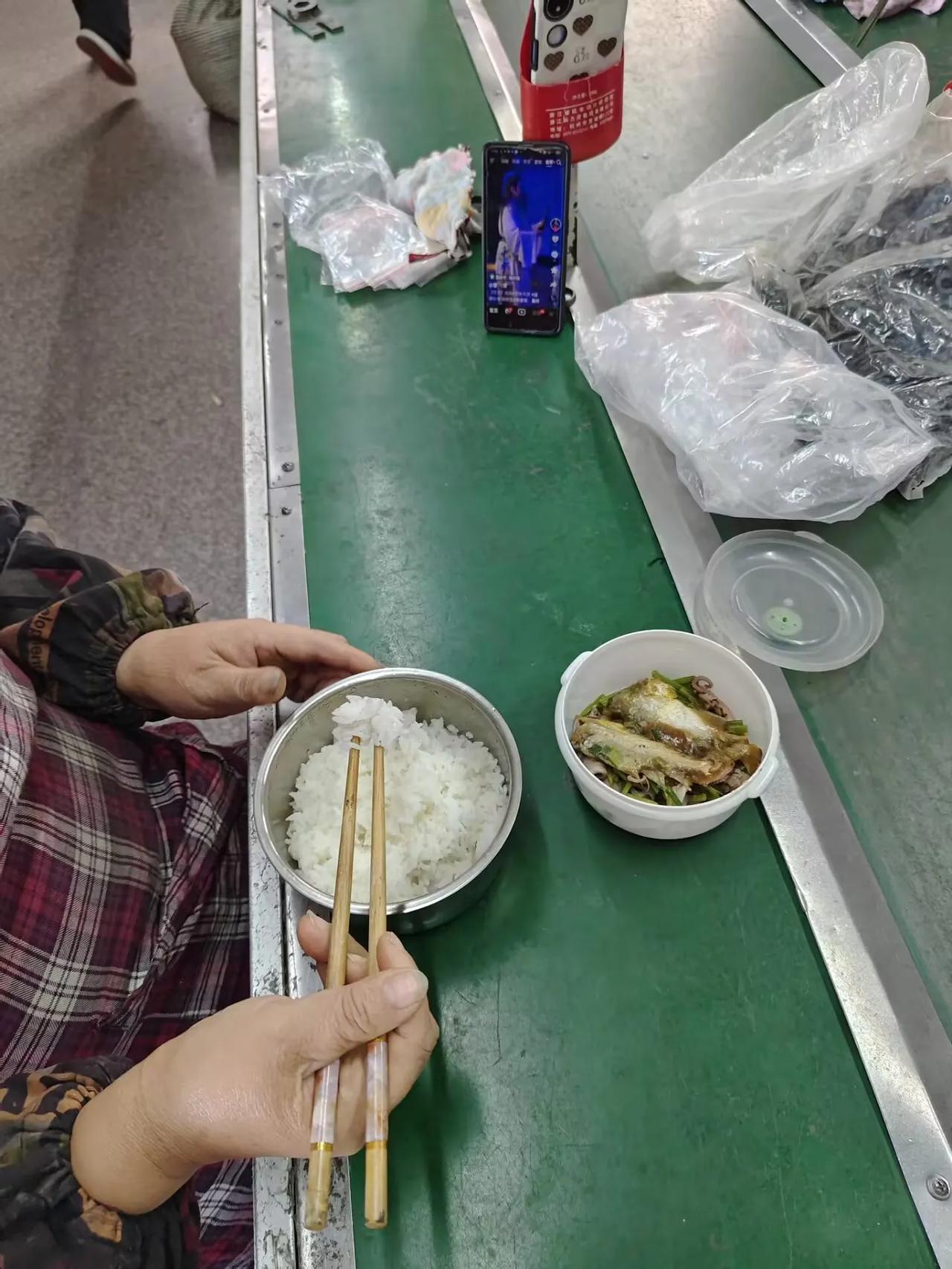 今天看到我们这里工厂流水线上班的工人的中餐,既有点开心,又有点心酸! 上午在厂里接待了一个尼泊尔的客户,客户是从义乌包车过来的,上午10点多一点才到厂里,谈完结束后刚好碰上饭点,我们这里是11点开始吃中饭。目送客户离开后,我到办公室收拾完样品,看到流水线上的阿姨们就在准备开始吃饭了。她们是每人自己带了一个小电饭锅,在家把米洗好放小电饭锅里面,再带一些早上的剩菜过来。应该在1 0点多一点就开始把饭煮着,这样11点左右刚好饭都能煮熟,当然剩菜也一起加热。然后就11点下班就开始吃刚煮熟热乎乎的香喷喷的大米饭了。这样其实也挺好不用去外面吃快餐,既不卫生,还要花更多的钱,而且吃饭还可以休息一下,还是挺舒服的。 不过让我吃惊的是,她们的饭量都好大,那么大一锅饭,全部都能吃完,可能干了一上午的活,也确实消耗很大。我开玩笑和她们说,你们这一顿吃的饭比我一天吃的饭还要多,但是我还长胖,羡慕你们吃这么多还长不胖。她们都在哈哈大笑,问我要不要和她们一起吃一点,我说不用了,我拍了几张照片,看到有的人就靠一块鱼肉下饭,要下那么一大锅饭,其他好一点的也就是2-3条小鱼,还有一个全是用蔬菜下饭,想起我刚毕业的时候,吃得和她们差不多,甚至还不如她们,顿时觉得心里一阵心酸…… 不得不说我心里还是要感激她们,因为我今年整年订单都非常多,所以她们一个月才只能休息两天,有时候一个月才休息一天,晚上也是天天在加班,有时候晚上加班累了,就会要求工厂老板放一晚上的假……正因为有了她们没日没夜的工作和支持,我的生意才能蒸蒸日上。感恩!!! 附上几张她们中餐的照片!
