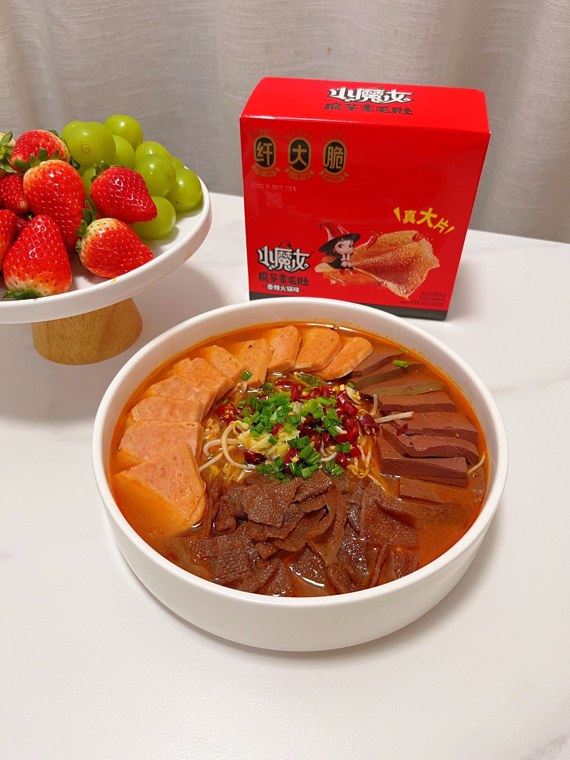 🎊对于美食爱好我来说,探索不同的吃法与搭配可以为味蕾带来更多的惊喜,今天用卫龙的小魔女素毛肚新品做了一道开胃家常毛血旺,鸭血滑嫩,大片大片的素毛肚脆脆的口感,富含膳食纤维,香辣过瘾,一口下去太满足了~