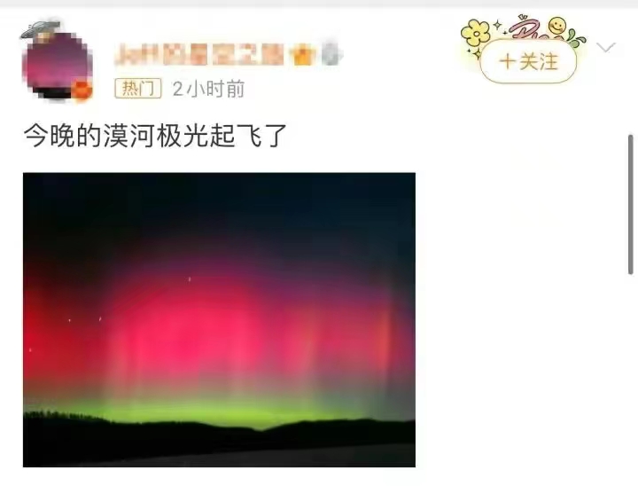 #什么是地磁暴 对日常生活有影响吗# 太阳活动频繁,造成了地磁暴,然后在高纬度地区就形成了极光。没想到今年地磁暴活动这么厉害,据说在北京都看到了微弱的极光。下面是分享的照片,大家可以看一看!但是有可能手机通讯会受到影响,信号会减弱,通话质量会降低,说不定还能听到呲哒呲哒的声音。当然不要放信鸽出去活动,有可能他们会迷路。