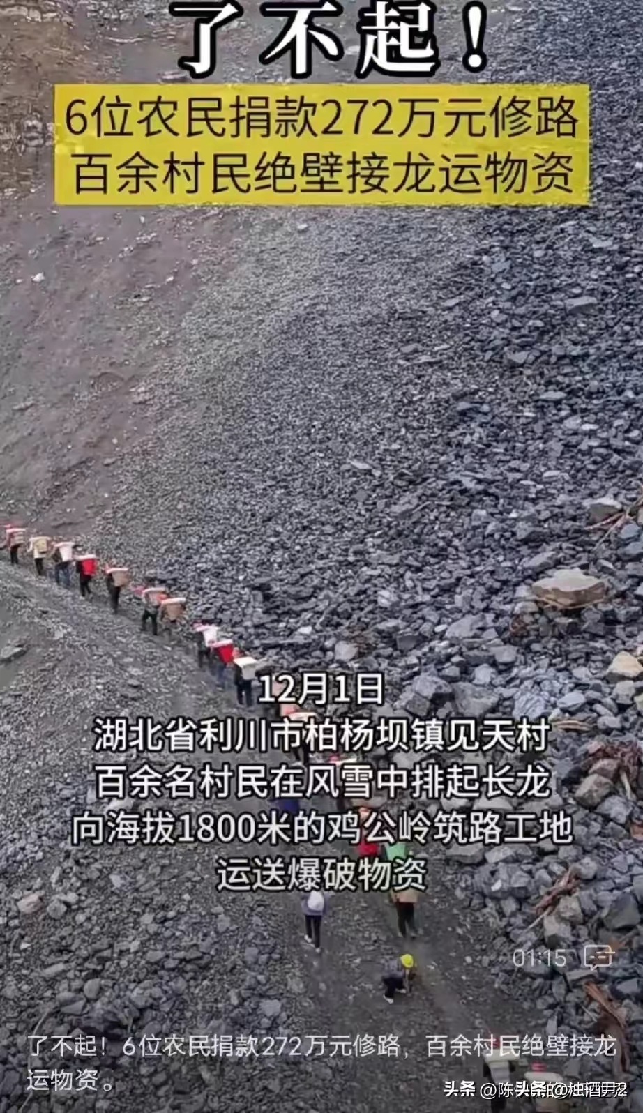 在这种情况下,有6名村民站了出来,自发捐款272万元,要修通这条路。其他的村民没有这么多钱,他们决定出人力一起来修路。就看到了这样的壮观情景,100多村民冒着风雪在海拔1800米的鸡公岭筑路工地,排起长龙运送爆破物资。