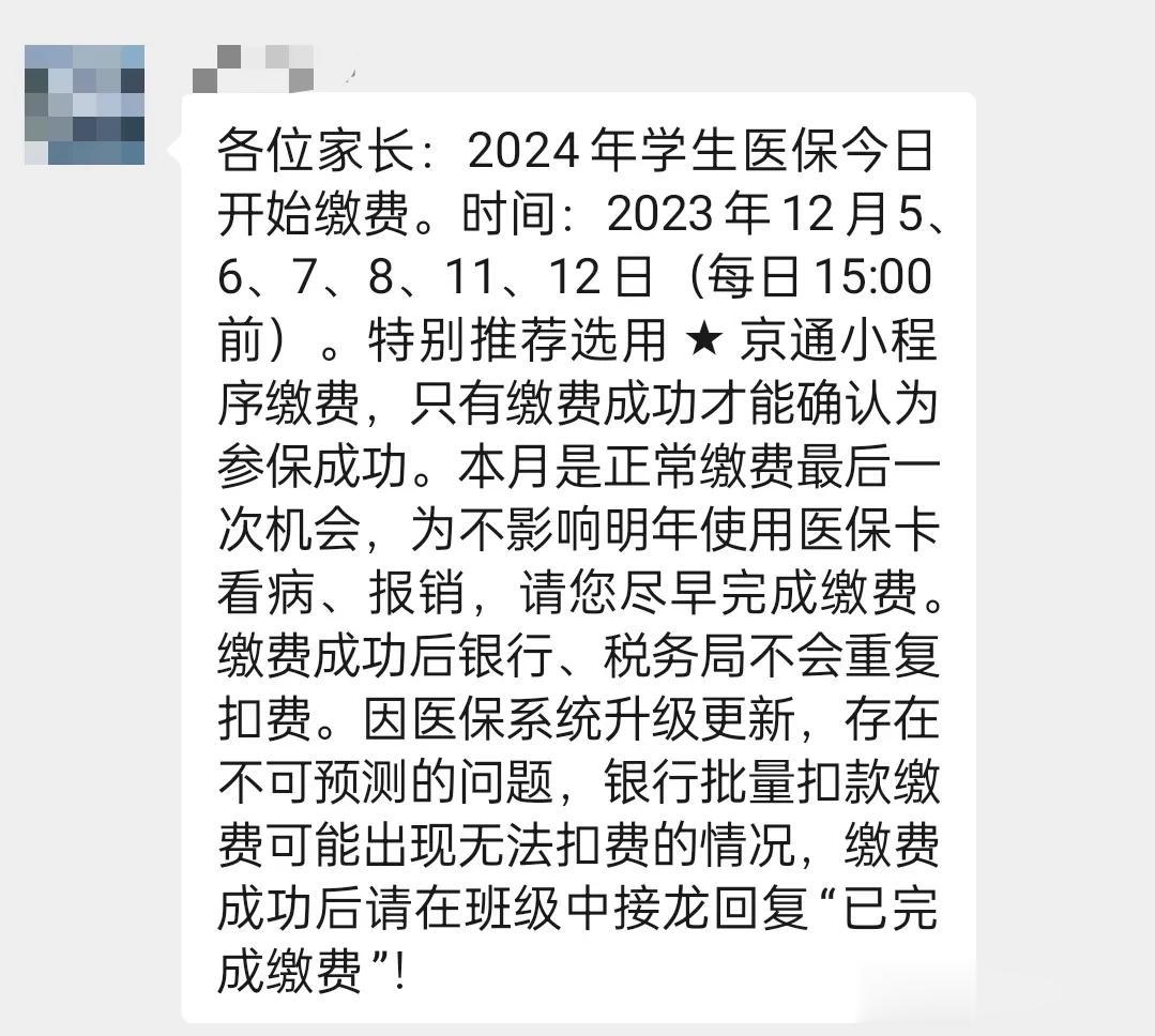 求大神指点[作揖]坐标北京,班级群里老师发消息提醒一老一小医保缴费(最晚到12日