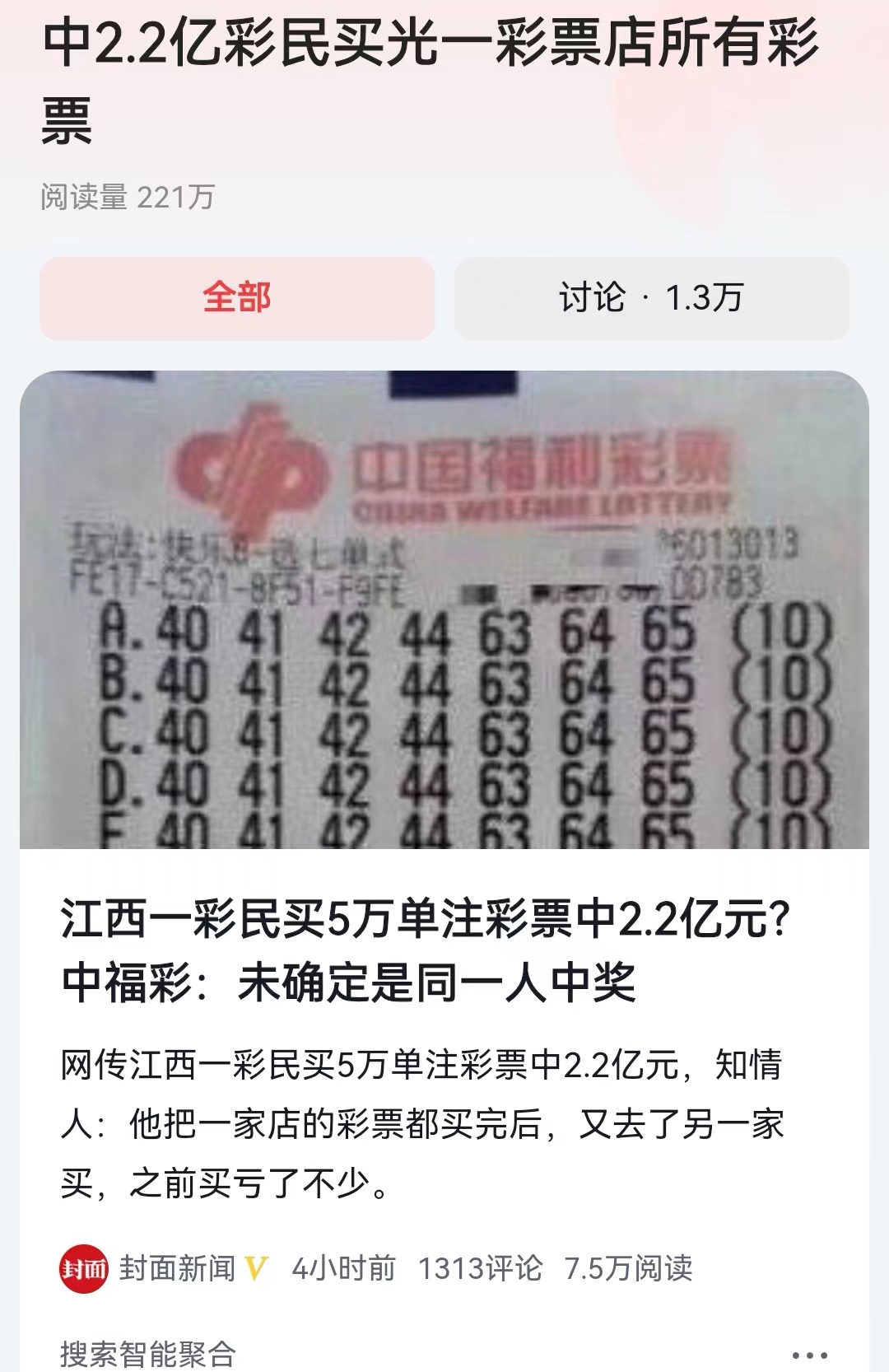 别去围观了,也别去守候了,这个事儿到底真相如何,大家自己猜吧!经过这两天的舆论发酵,江西省福彩中心估计也不会做更进一步的通报。如果真的是亿万分之1的概率,那我们就祝福这位金手指吧。如果不是,那我们就等真相吧。