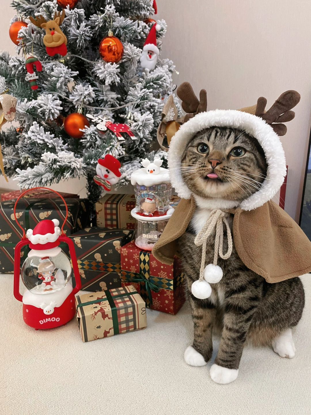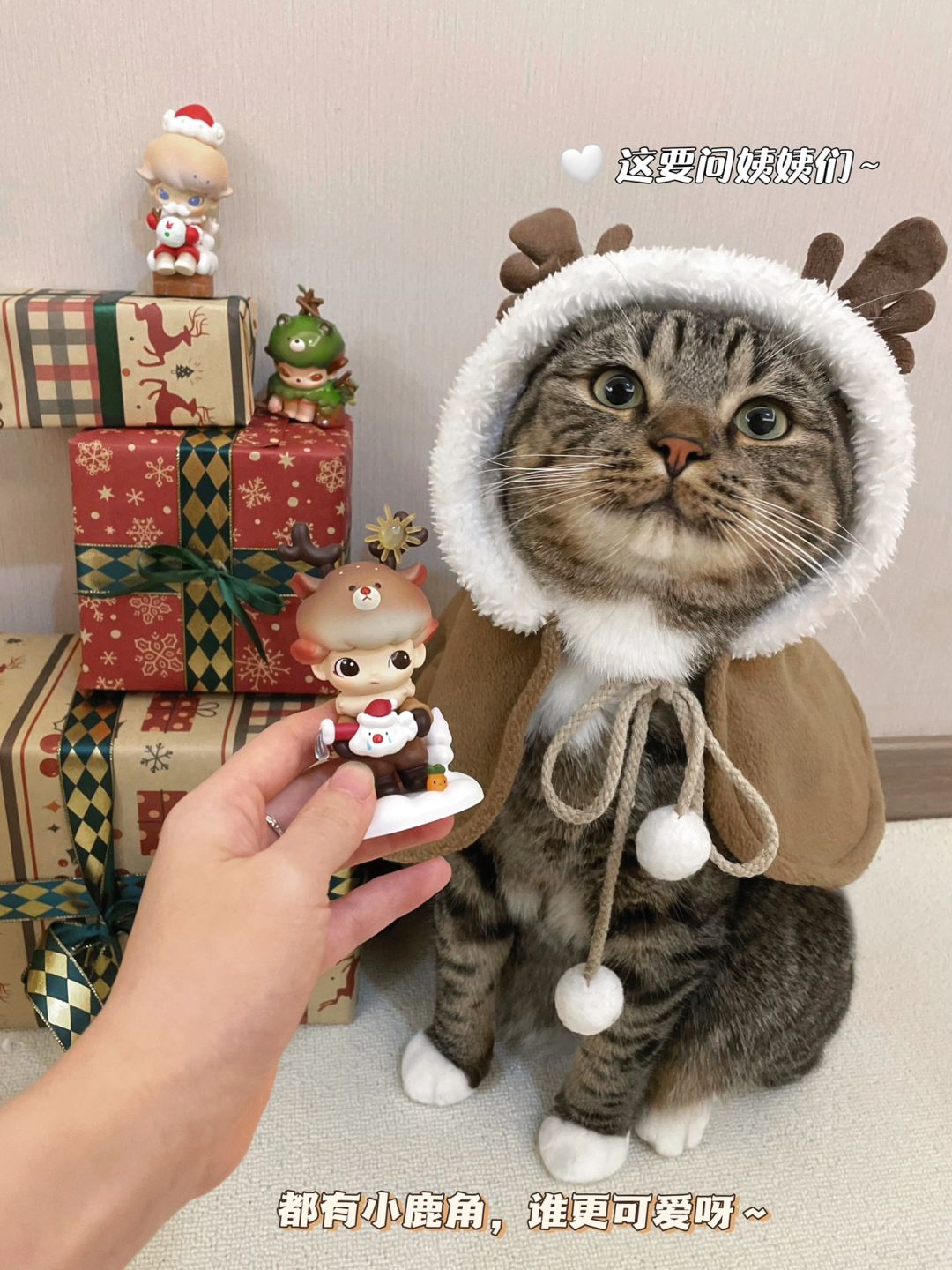 马上圣诞节啦~ 提前给饼饼置办了一套“圣诞装备”!别说,饼饼穿上小麋鹿披风往树下一站,还有点威风凛凛[哇R]~