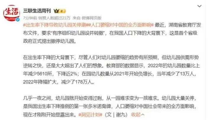 #出生率下降导致幼儿园关停潮# 2022年全国关停了5600个幼儿园,面对我国晚婚晚育、不婚不育、人口快速老龄化的潮流,葛先生提个建议,可不可以把关停的幼儿园,逐步的都改造成社区养老机构,商业养老机构,让这些地方再一次被利用起来,应对我国老龄化社会后老人养老的问题。