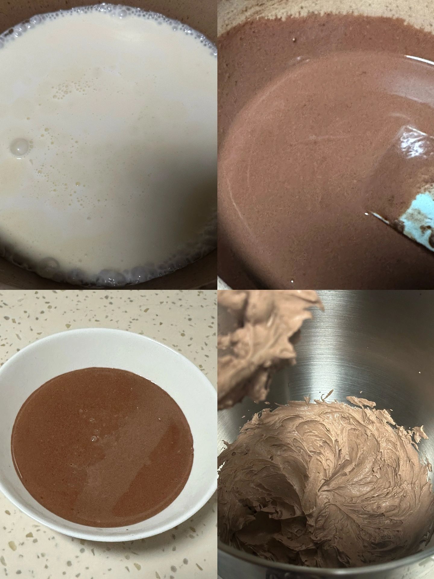 奶油煮沸后关火加入糖和巧克力拌匀,冰箱冷藏冰冷后打发使用