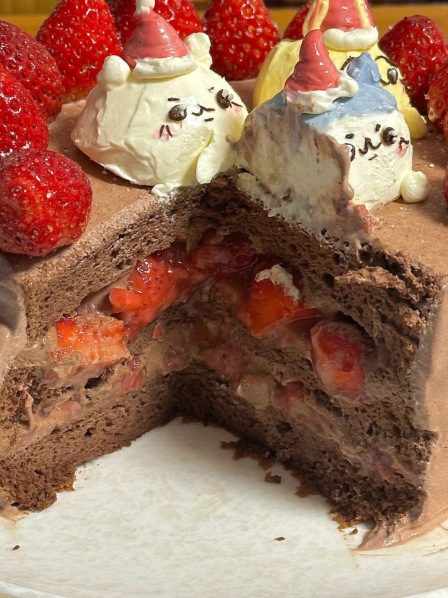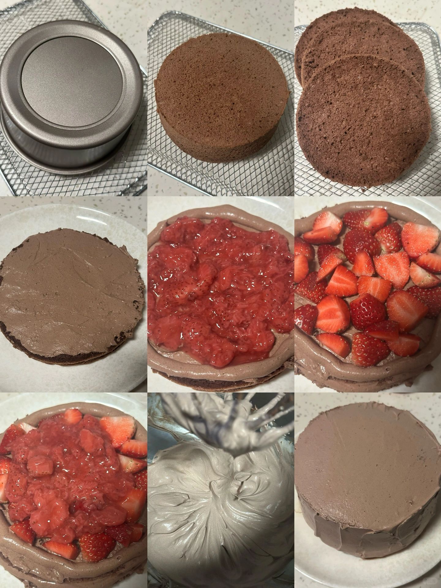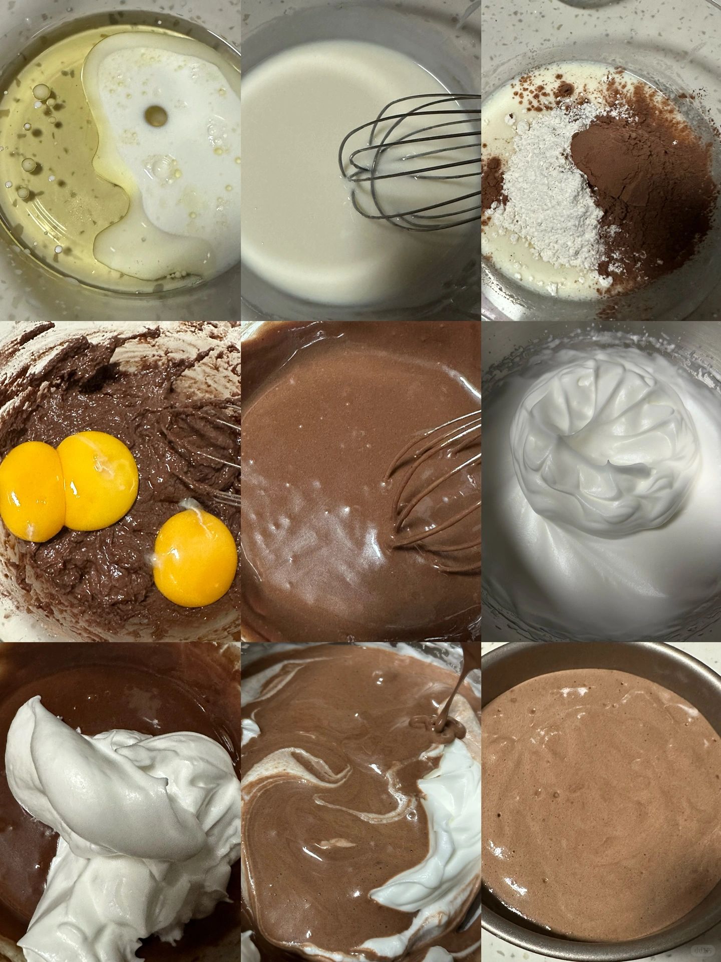 蛋糕胚:40g玉米油、53g牛奶、44g低筋面粉、3个蛋黄、10g可可粉、3个蛋清、35g糖