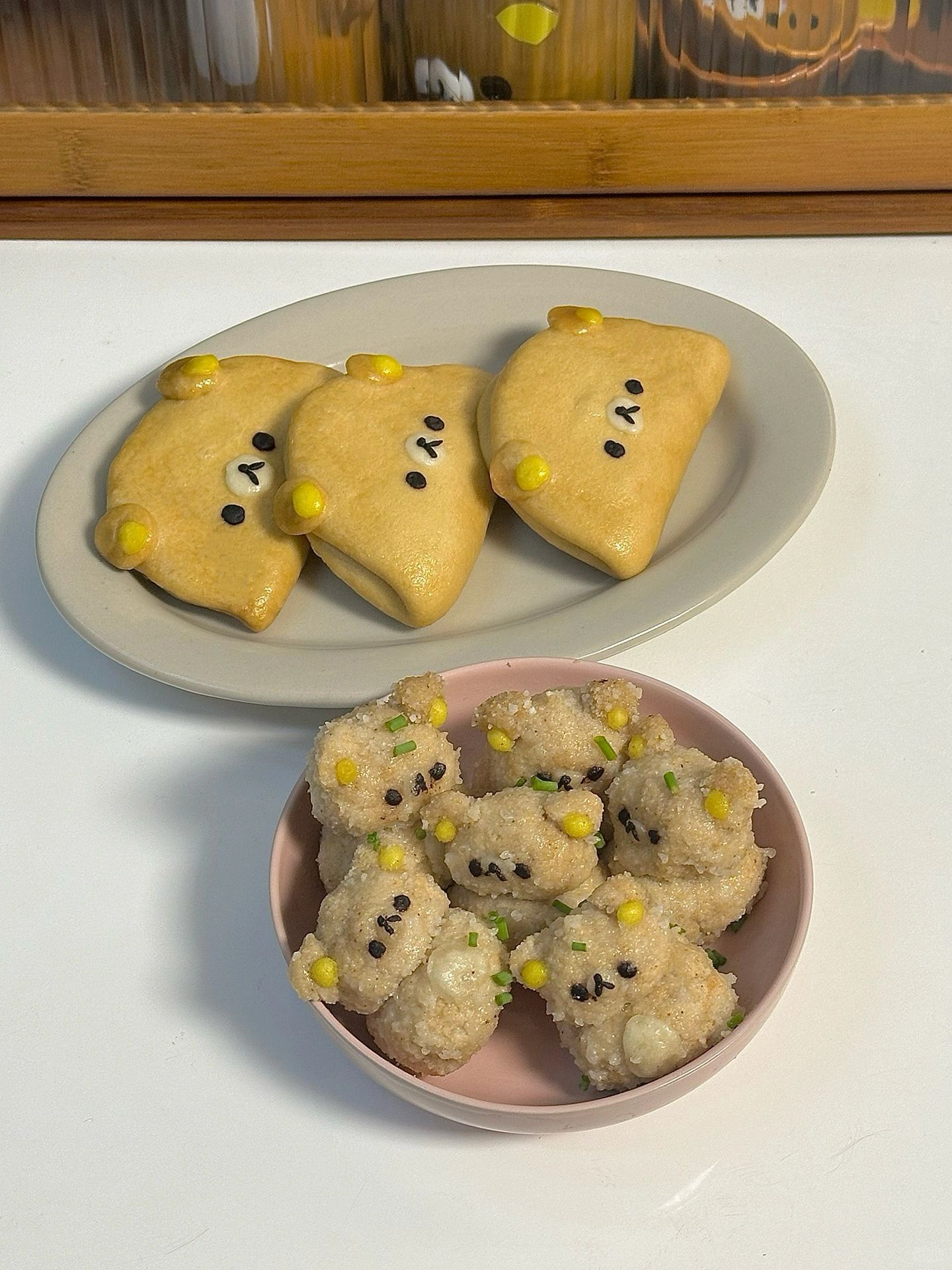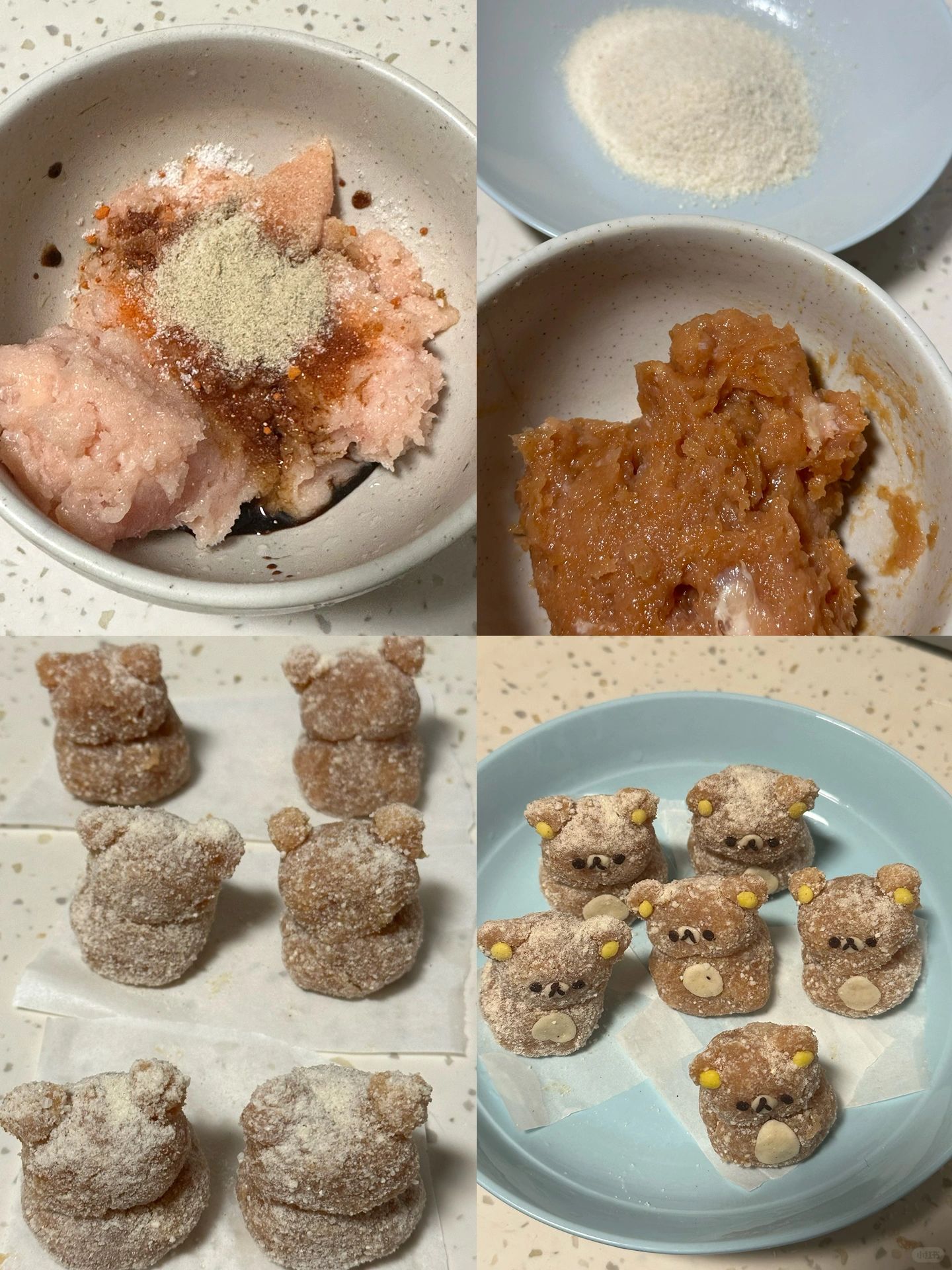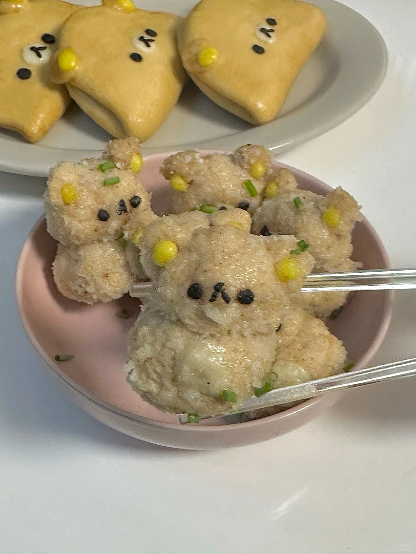 太可爱了哈哈哈哈 配料: 荷叶饼:100g面粉、2g酵母、50g水、8g糖 调色:老抽(脸)、可可粉(五官)、南瓜粉(耳朵) 粉蒸肉:肉、粉蒸肉米粉、盐、糖、酱油、辣椒粉、胡椒面 1.荷叶饼配料混合均匀,分份调色,揉光滑(这里留点一会做粉蒸肉表情) 2.取45g棕色面团擀成椭圆形,中间抹油后对折,做出表情细节,发酵40分钟后蒸15分钟 3.肉打成泥后加入调料搅拌上劲,盖上保鲜膜放冰箱30分钟左右 4.捏出小熊形状后沾上蒸肉米粉,贴上表情,水开下锅蒸20分钟