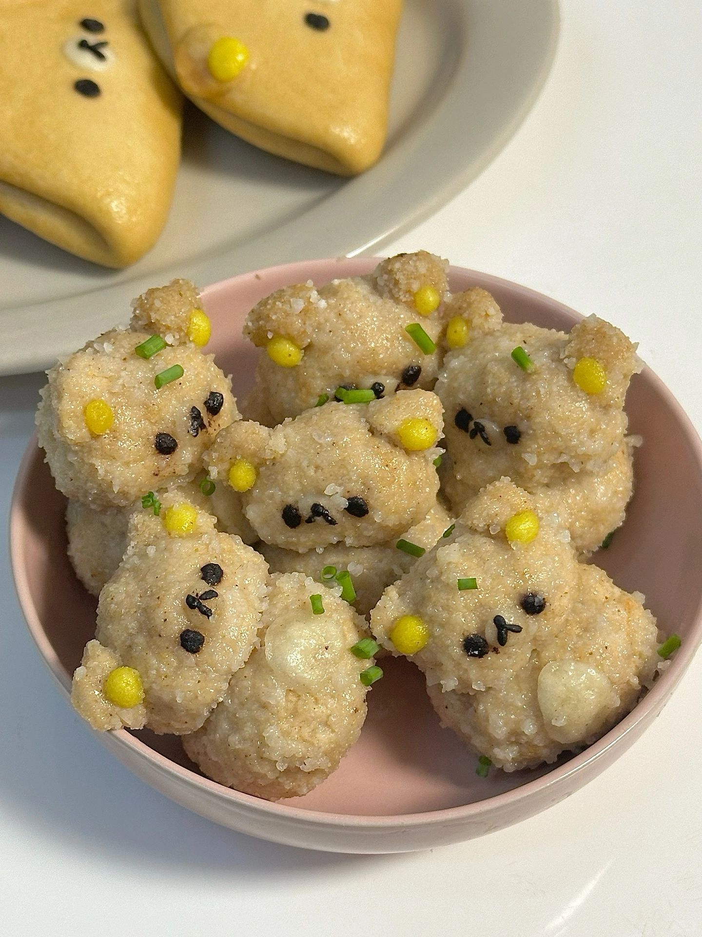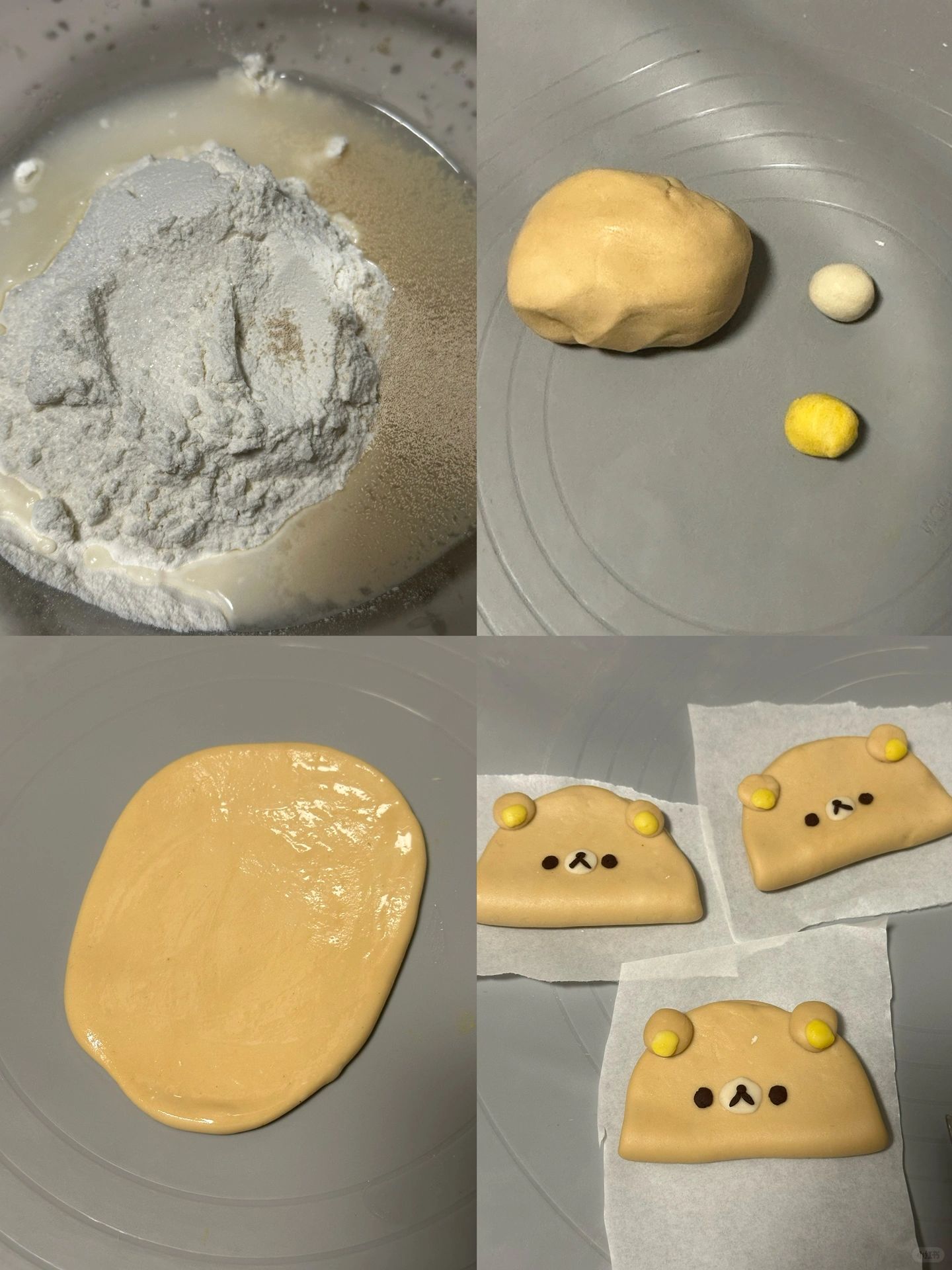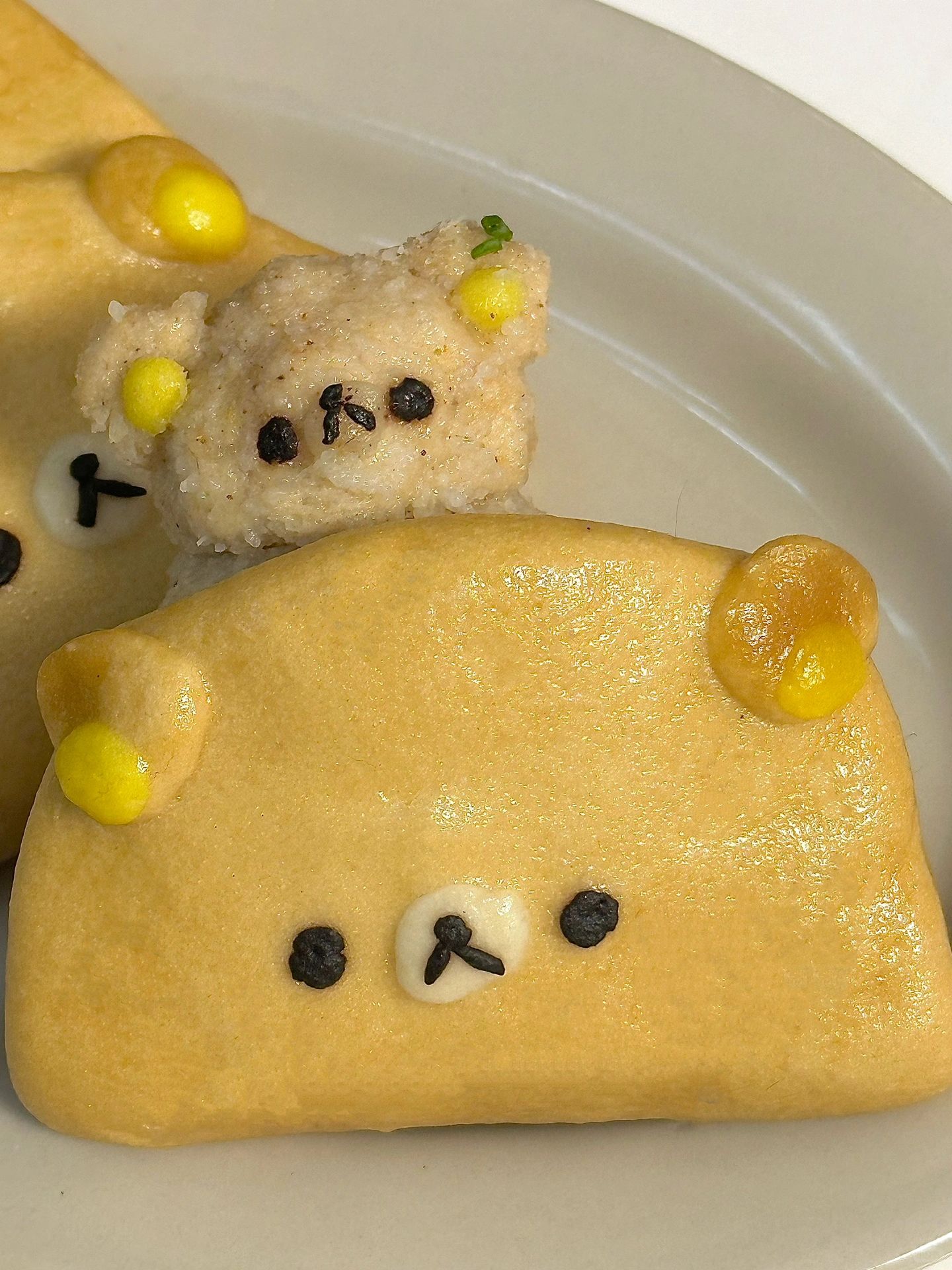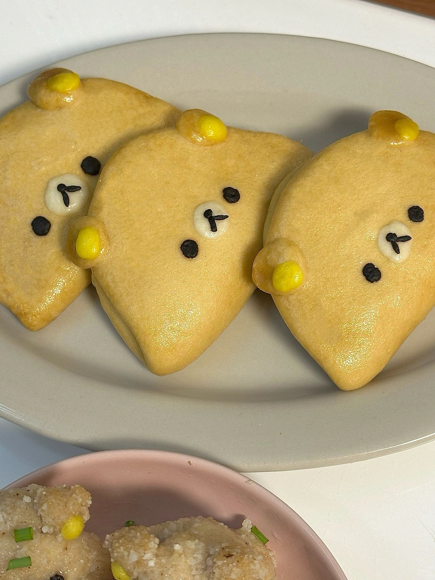 太可爱了哈哈哈哈 配料: 荷叶饼:100g面粉、2g酵母、50g水、8g糖 调色:老抽(脸)、可可粉(五官)、南瓜粉(耳朵) 粉蒸肉:肉、粉蒸肉米粉、盐、糖、酱油、辣椒粉、胡椒面 1.荷叶饼配料混合均匀,分份调色,揉光滑(这里留点一会做粉蒸肉表情) 2.取45g棕色面团擀成椭圆形,中间抹油后对折,做出表情细节,发酵40分钟后蒸15分钟 3.肉打成泥后加入调料搅拌上劲,盖上保鲜膜放冰箱30分钟左右 4.捏出小熊形状后沾上蒸肉米粉,贴上表情,水开下锅蒸20分钟