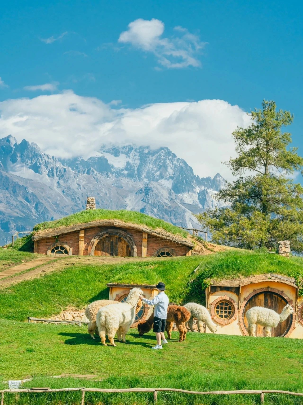玉龙雪山下仙境般的花园。花园里有霍比特小屋,鲜花盛开在身旁,抬眼就能看到远处的雪山。在这里吃饭可以免票哦,味道很不错。