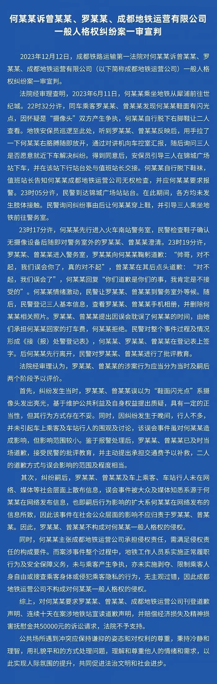 在今年的6月11日,成都地铁上晚间,何某某穿了一双鞋,被坐在对面的两个女孩,罗某某和曾某某认为装了偷拍设备。然后当着众人面争执并且脱下了何某某的鞋作为证据,最终在地铁警务室证实,鞋子正常没有偷拍。而在这个过程中,两名女子用视频记录,何某某认为自己的权益遭到了侵犯,不肯接受女子口头道歉,最后诉至法庭,要求罗某某、曾某某、成都地铁运营公司刊登道歉声明、连续十天在案涉地铁站宣读道歉声明,并赔偿经济损失及精神损害抚慰金共50000元的诉讼请求。