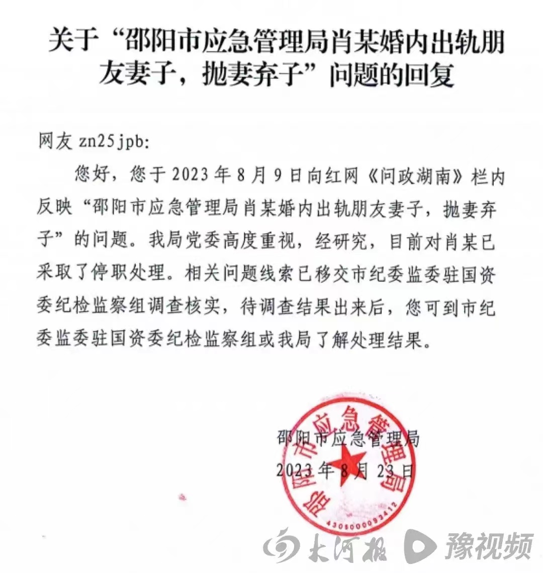 #副局长被儿子举报出轨 已撤职# 亲儿子和妻子在今年8月一起举报,内容是婚内出轨朋友的妻子,而且涉嫌贪赃枉法,收受贿赂。这种举报的力度是非常强大的,这就是“自曝家丑”式的举报,一般来说,信息可靠性很高。但是湖南邵阳市应急管理局的处理方法让人不解,他们这样处理合适吗?