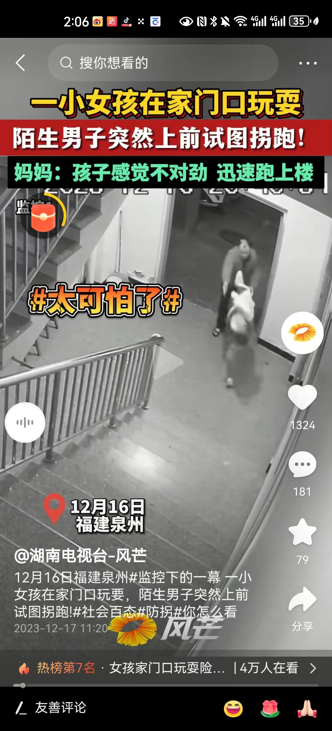 #女孩家门口玩耍险遭陌生人捂嘴带走# 福建泉州打击人贩的力度看着要加强!从监控视频来看,这个小女孩也很警觉。有没有一种可能就是当地这类犯罪相对比较多,所以小孩子也从小被教育的见到陌生人就跑?目前家长已经报警,希望根据监控录像可以抓到犯罪嫌疑人,他可真正属于叫拐卖人口未遂!