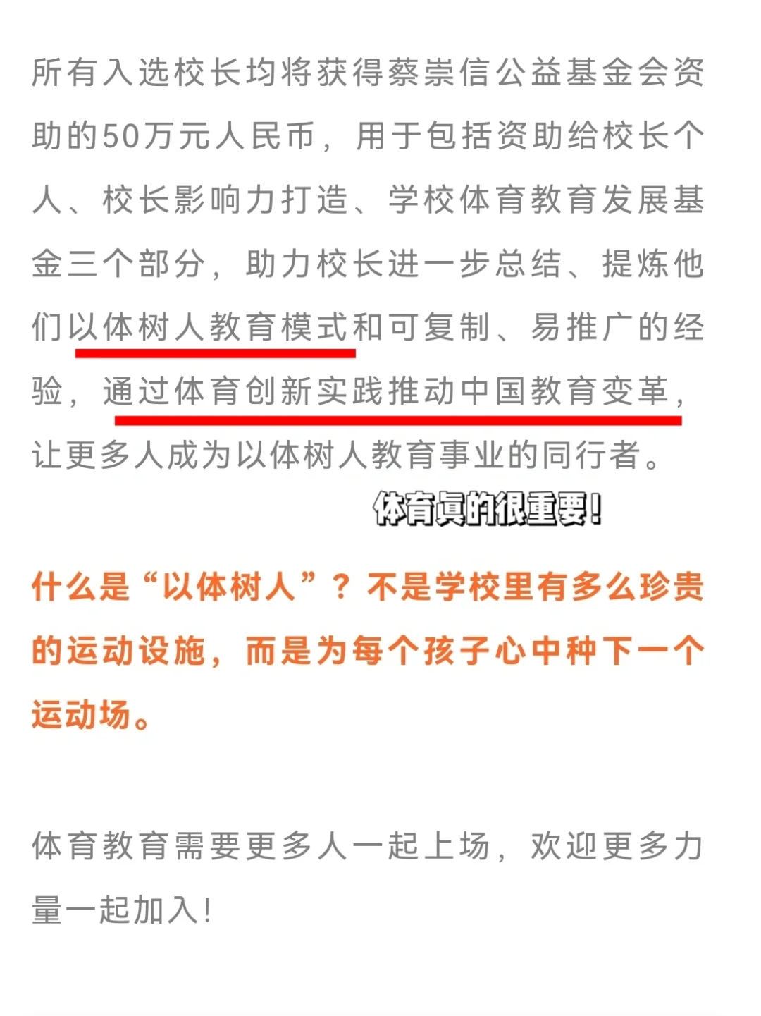 而且,社会各界现在真的很重视体育人才的培养,像阿里的蔡崇信公益基金会,每年都会资助10名具有体育精神的校长,以此来促进体教融合。我们昆明的金康路小学,今年就得到了50万元的资助。他们学校周一到周五每天都有体育课,每周还有一节篮球课和足球课,特别棒!