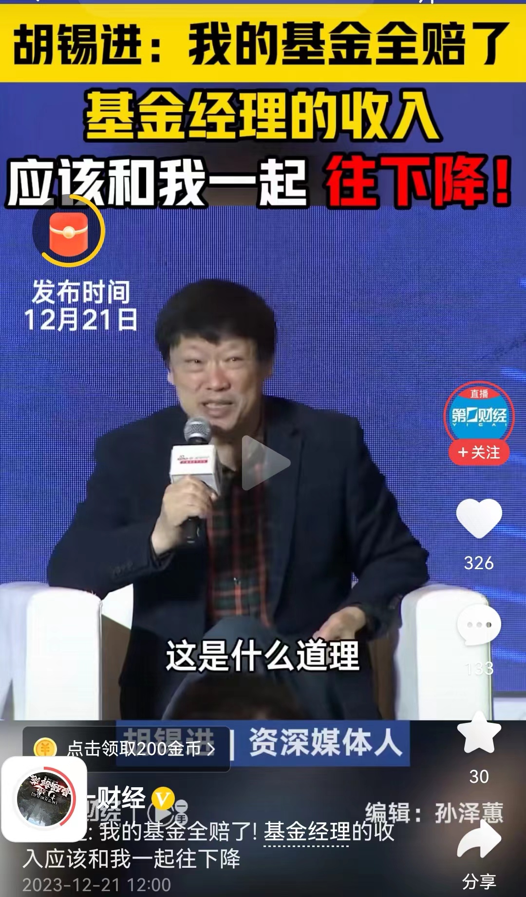 所以胡锡进在12月21日的发言就很具备典型,也代表了广大基民的心态,“我们都亏了,他(基金经理)还在那里赚,这是什么道理?中国主要是散户多,散户多呢,主要是大家可能不怎么相信基金。我反正买了几只基金,那几只基金全赔了,而且赔的比例挺高的”。