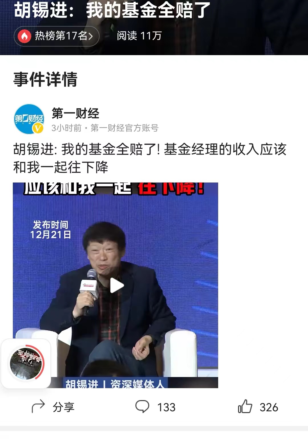 #胡锡进:我的基金全赔了# 胡锡进确实想不通,自己作为一个啥也不懂的股民,买的股票亏损了。但是他同时也买了三支基金,现在也都亏了,而且亏损的比例比自己买的股票还多,这又是什么道理?再看看这些基金经理,好像收入也没受啥影响,就觉得更没有道理了。但很可惜,这就是我们 a股现在正在发生的情况。