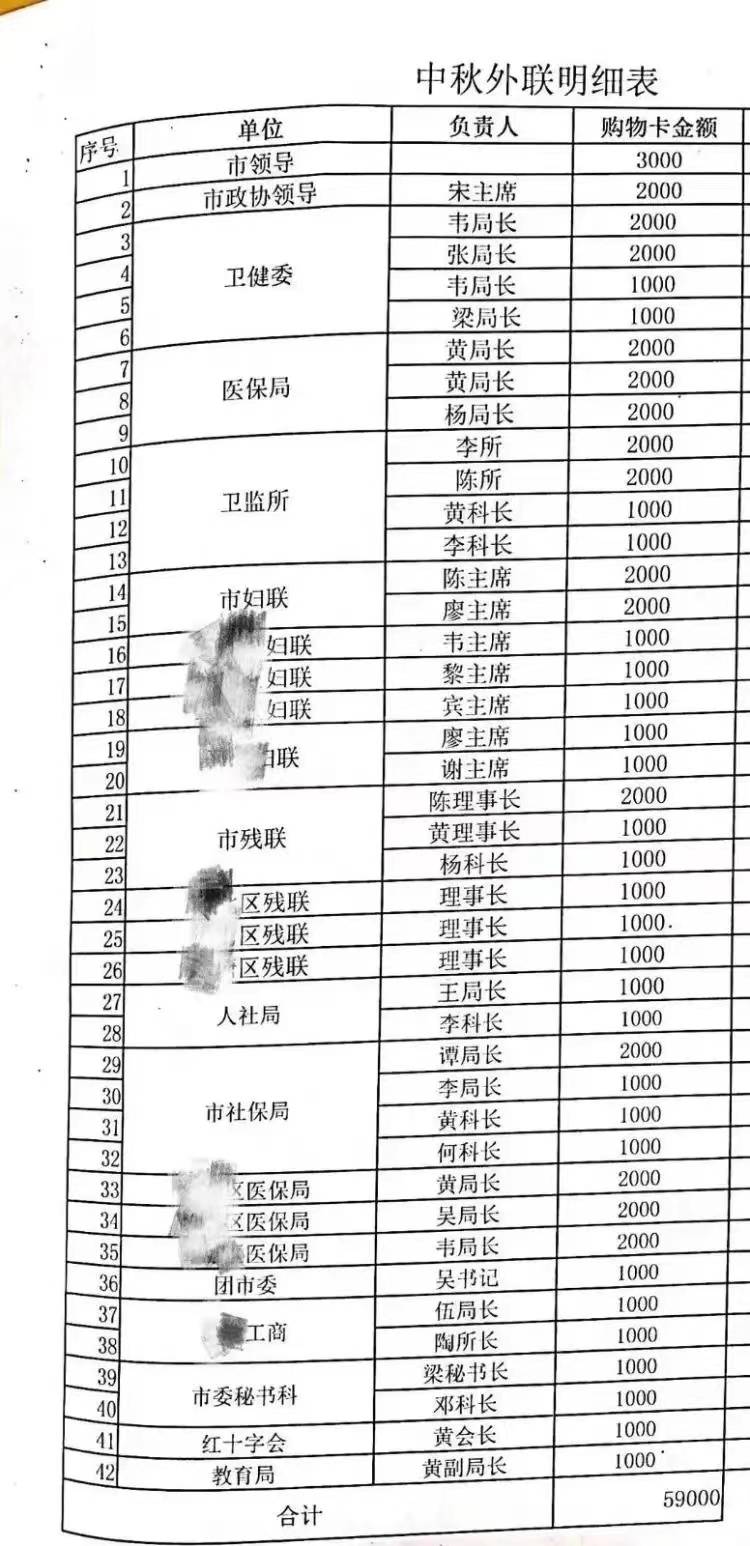 艾芬又发公众平台内容,里面赫然是一张涉嫌行贿受贿的清单。这是他从一位粉丝那里得来的,自述这名粉丝是贵港爱尔眼科的前员工,这是公司内部在中秋节送礼品卡的汇总清单,涉及当地广西贵港市24个部门,一共42人,而且基本上都是本部门的负责干部。如果这份清单属实,这42人都应该受到处分,而且纪委需要介入,查明是否还有其他收受礼品的违纪违法行为。