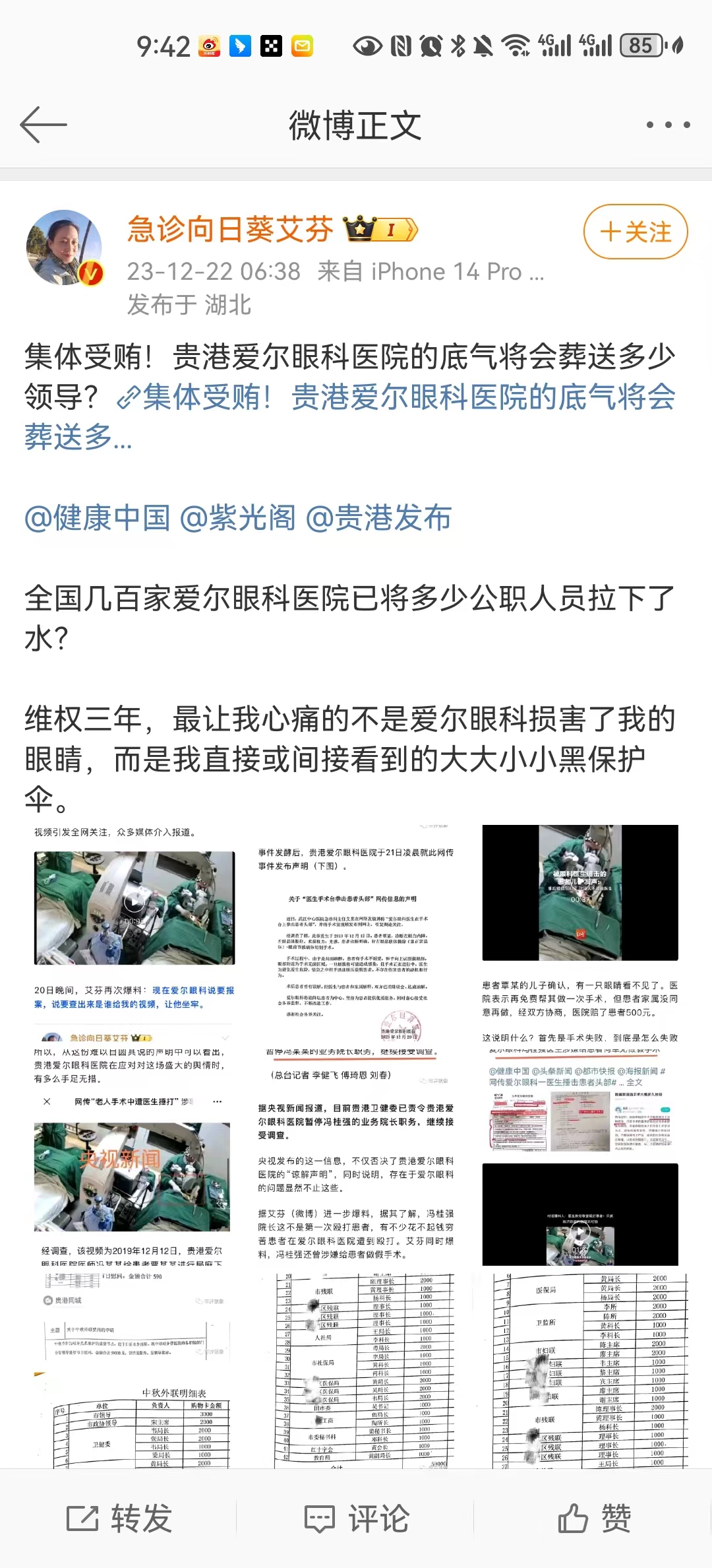 #爱尔眼科被曝贿赂公职人员 纪委回应# 艾芬在刚刚发布完广西贵港爱尔眼科医生在手术室内,锤击做白内障的老人之事后,目前院长被免职,涉事医生被停职。但是大家都知道艾芬是跟爱尔眼科杠上了,他又得到了猛料。