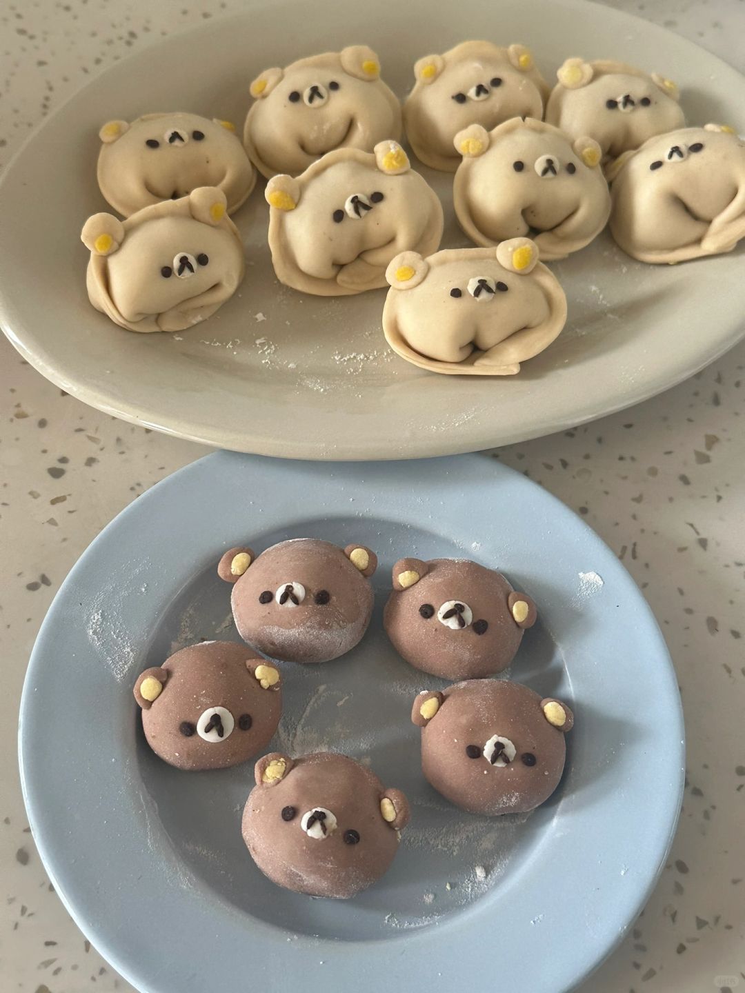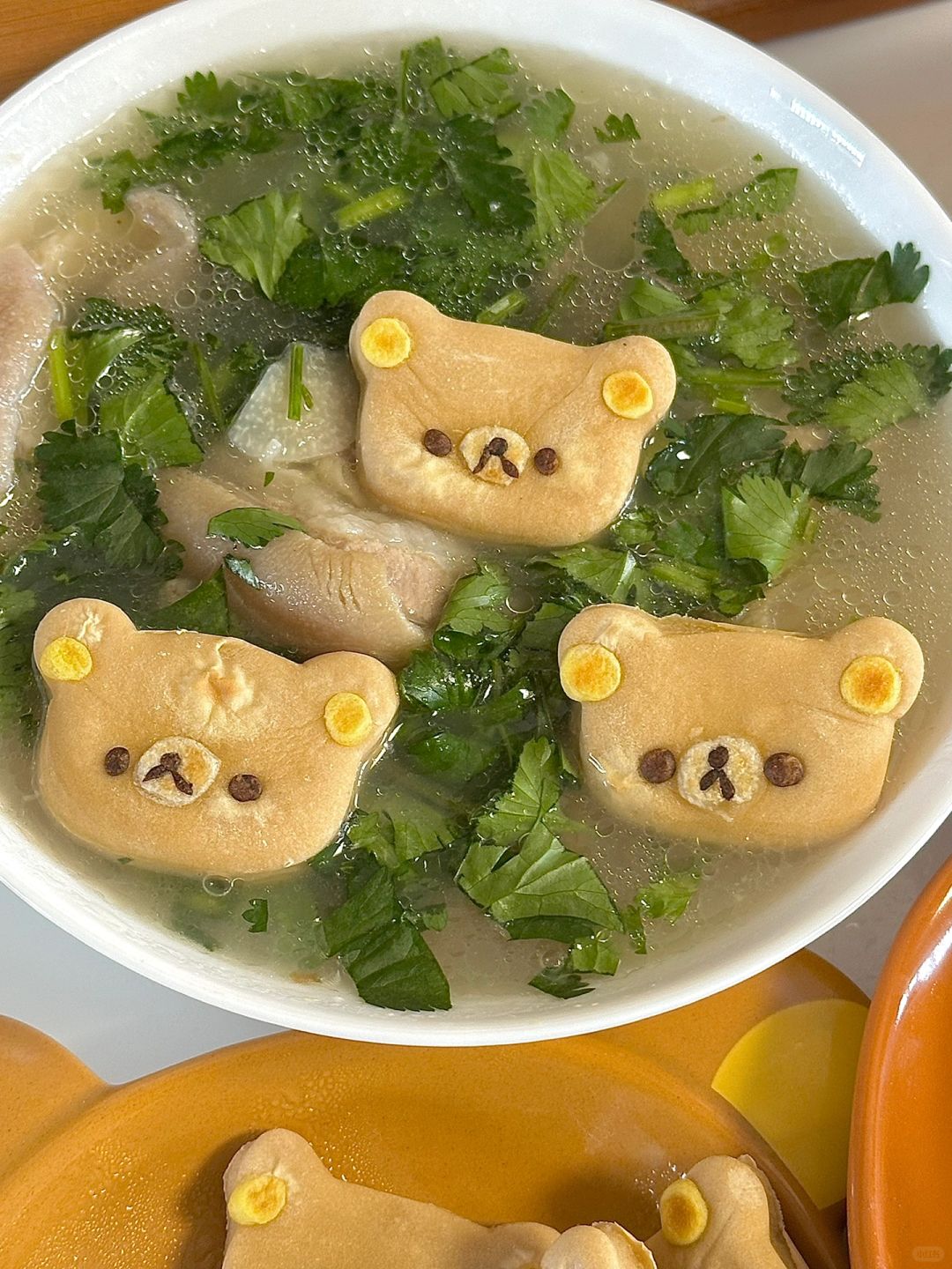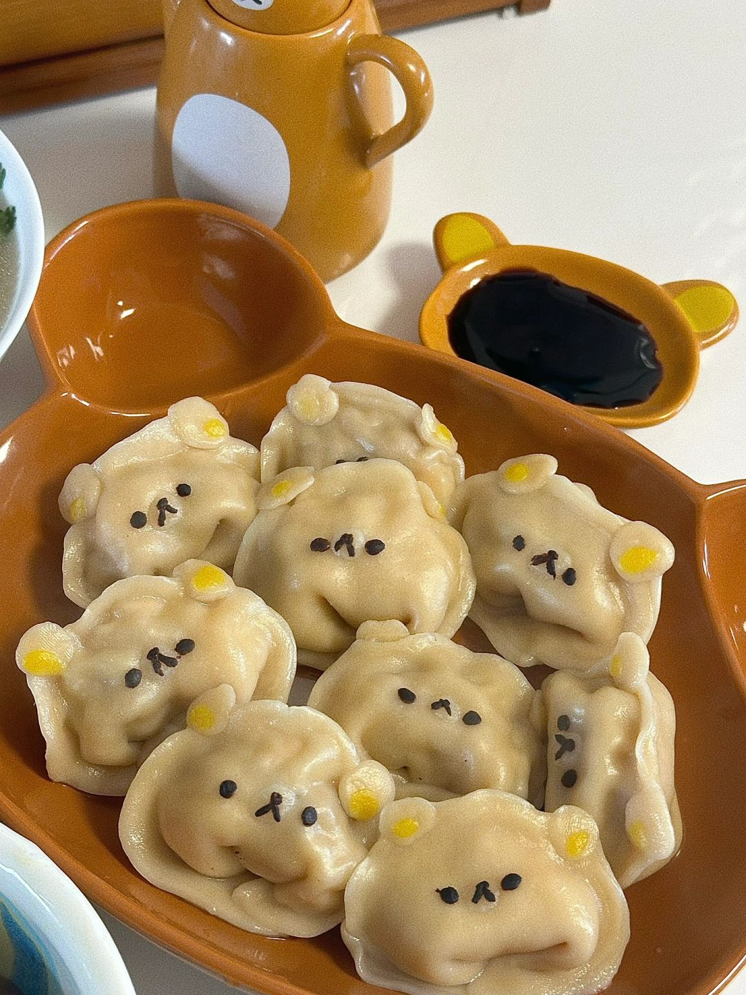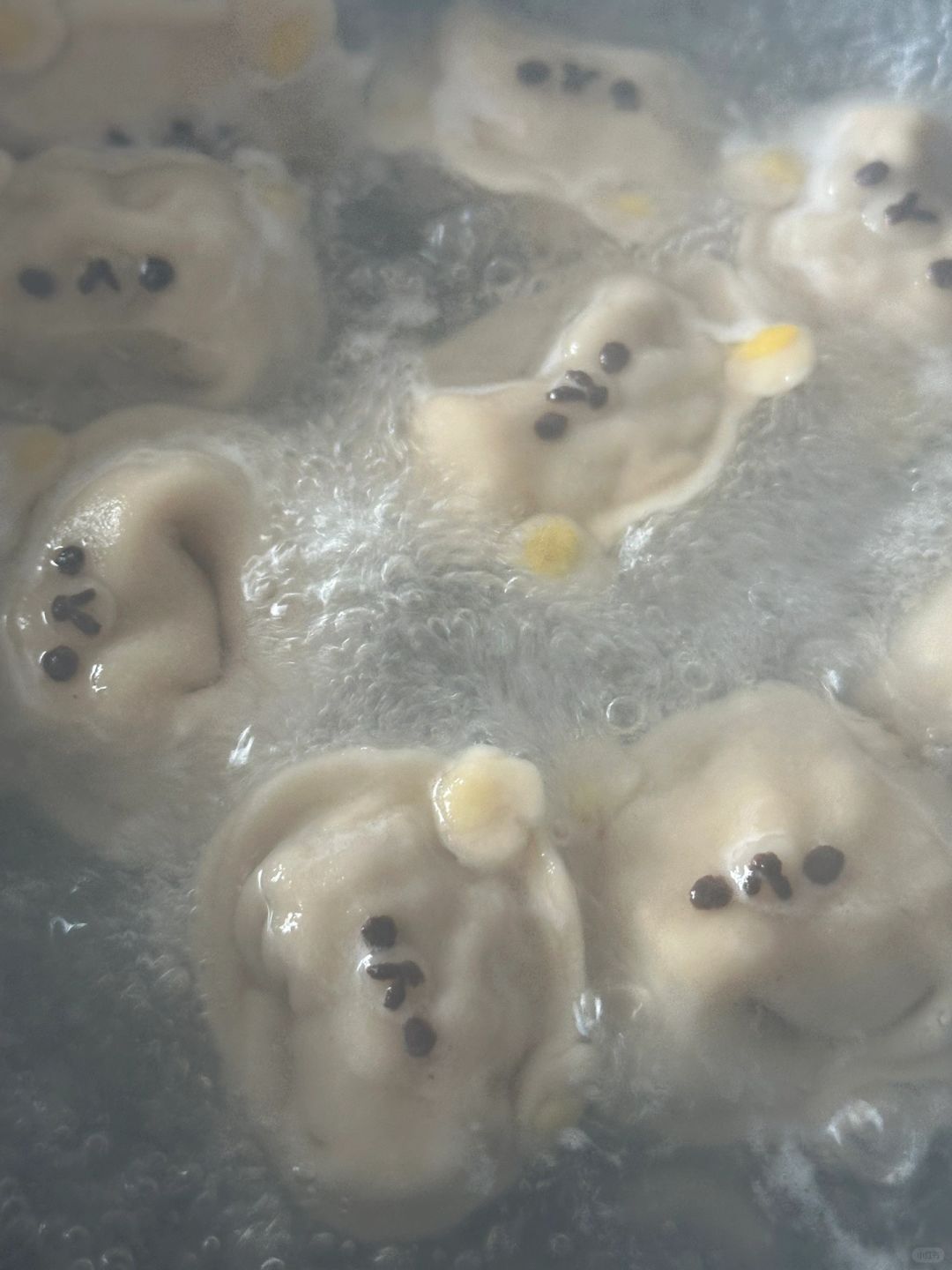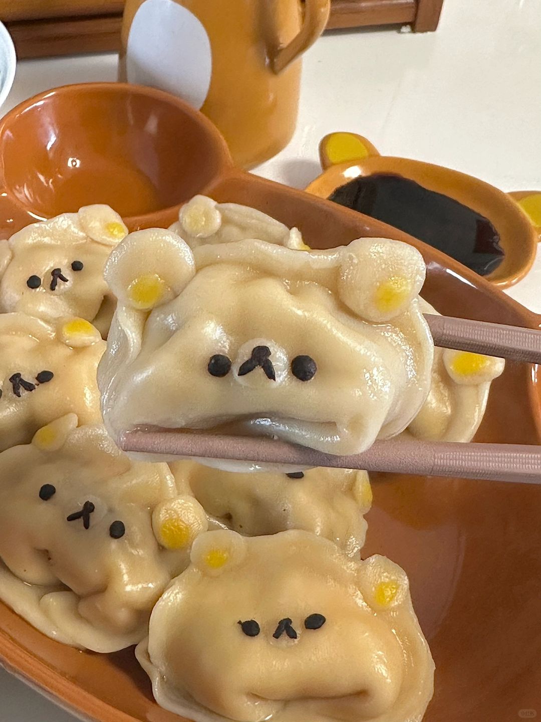 5.饺子皮擀扁包入馅料,装饰上轻松熊脸,煮至浮起
