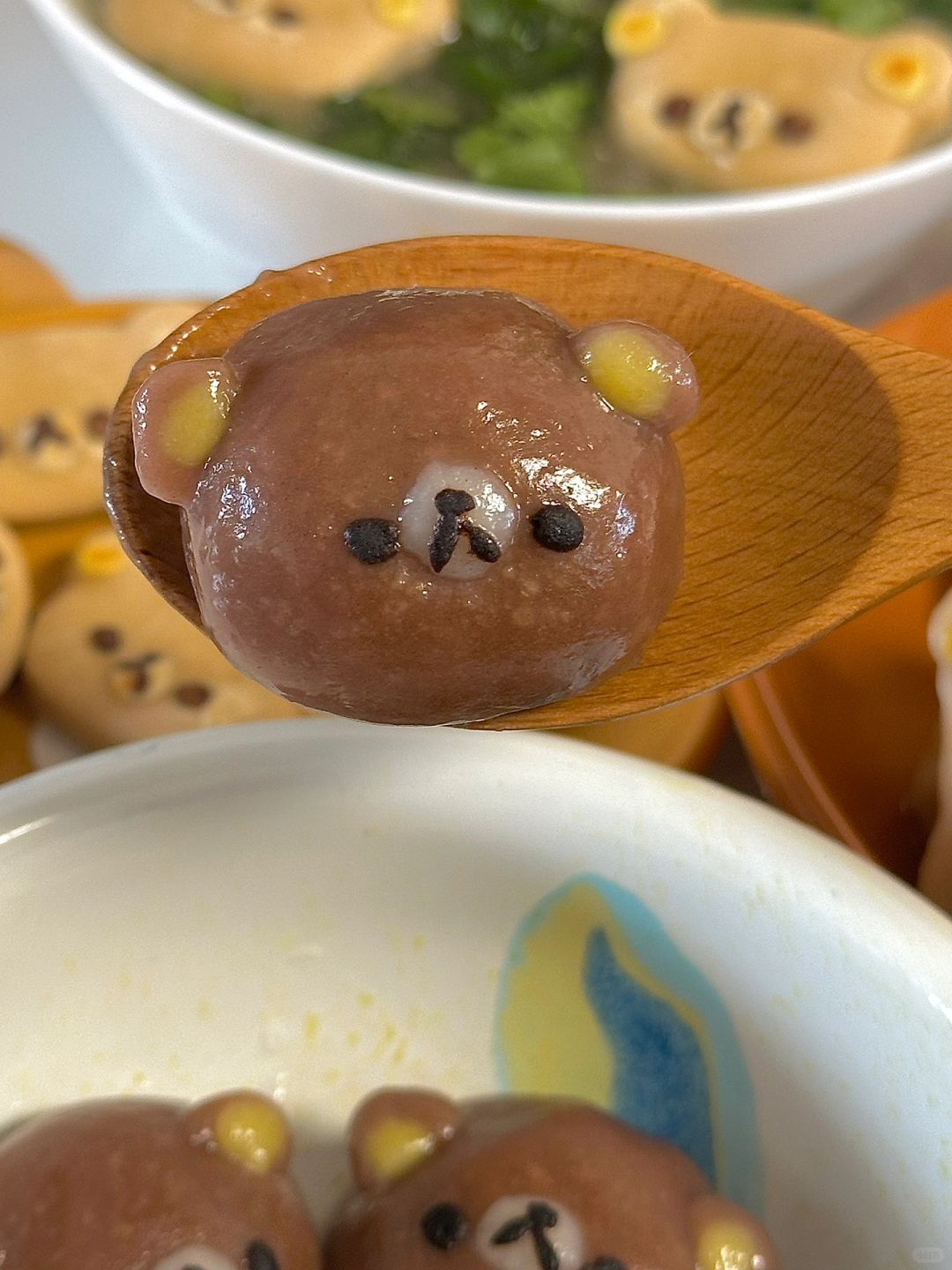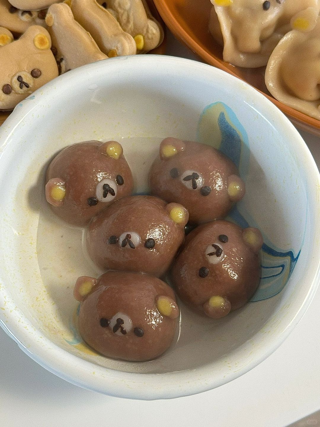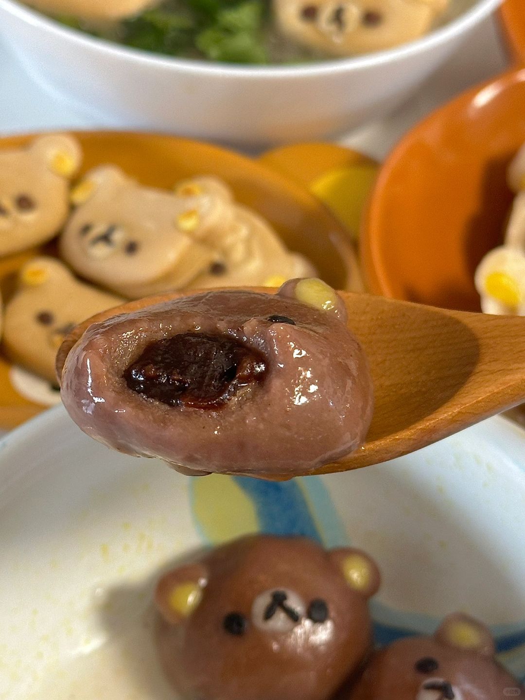 6.汤圆皮配料混合均匀,包入红豆沙,装饰上轻松熊脸,煮至稳定漂浮
