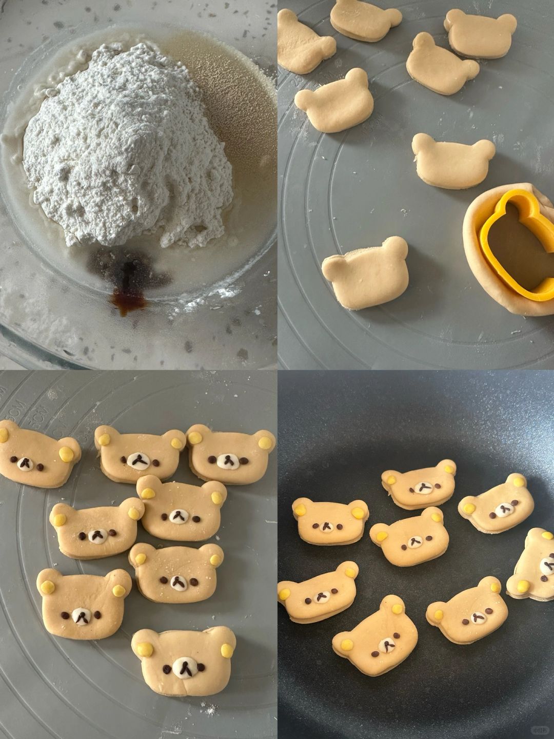 2.馍配料混合均匀揉光滑,发酵30分钟后擀扁,用饼干模具压出轻松熊头,装饰上表情,在平底锅中小火烙熟